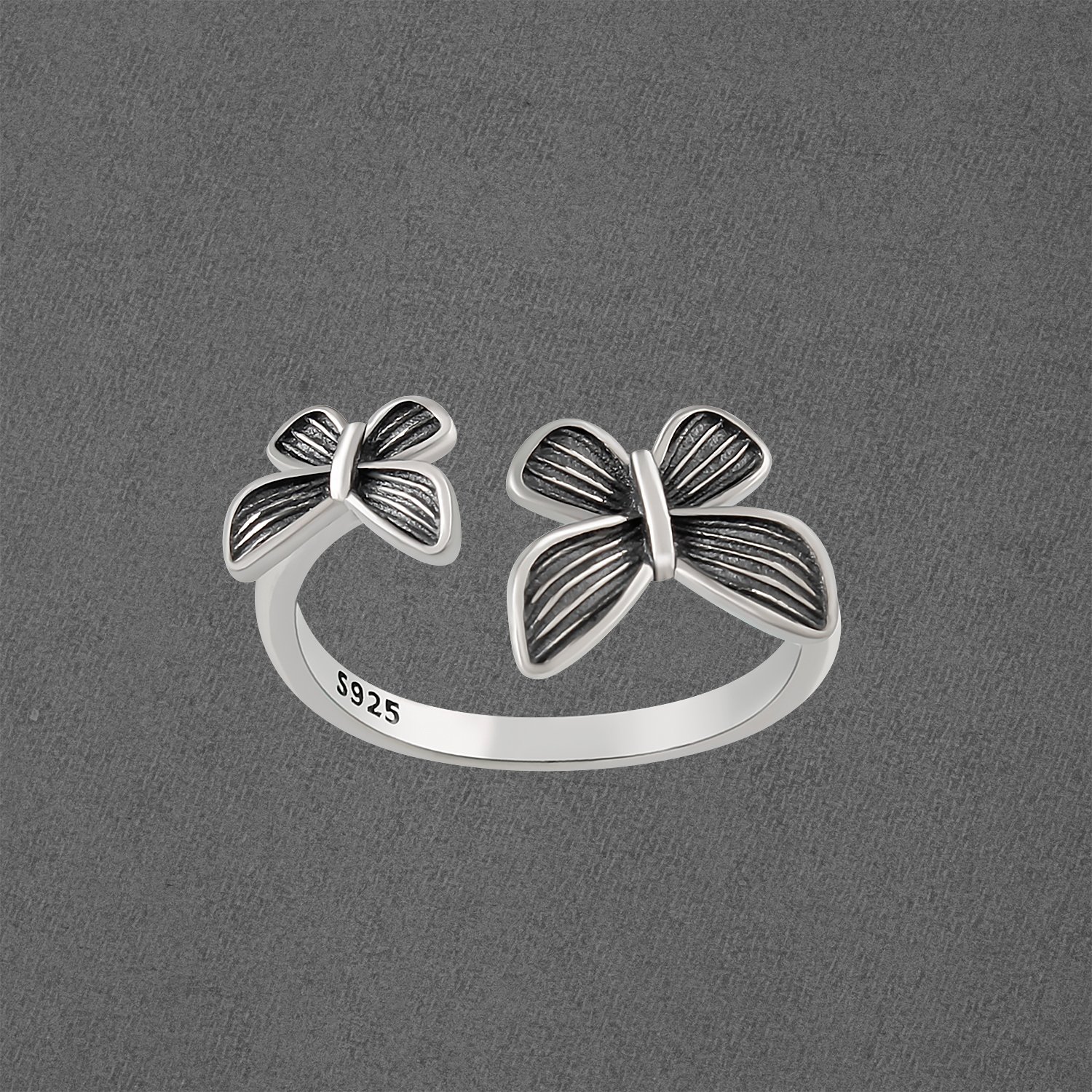 Delicate yet bold, this 925 sterling silver oxidized bow ring brings a touch of whimsy and charm to your jewelry collection. Featuring a dual bow design with intricate engraved details, this adjustable ring is perfect for those who appreciate artistry and unique craftsmanship.