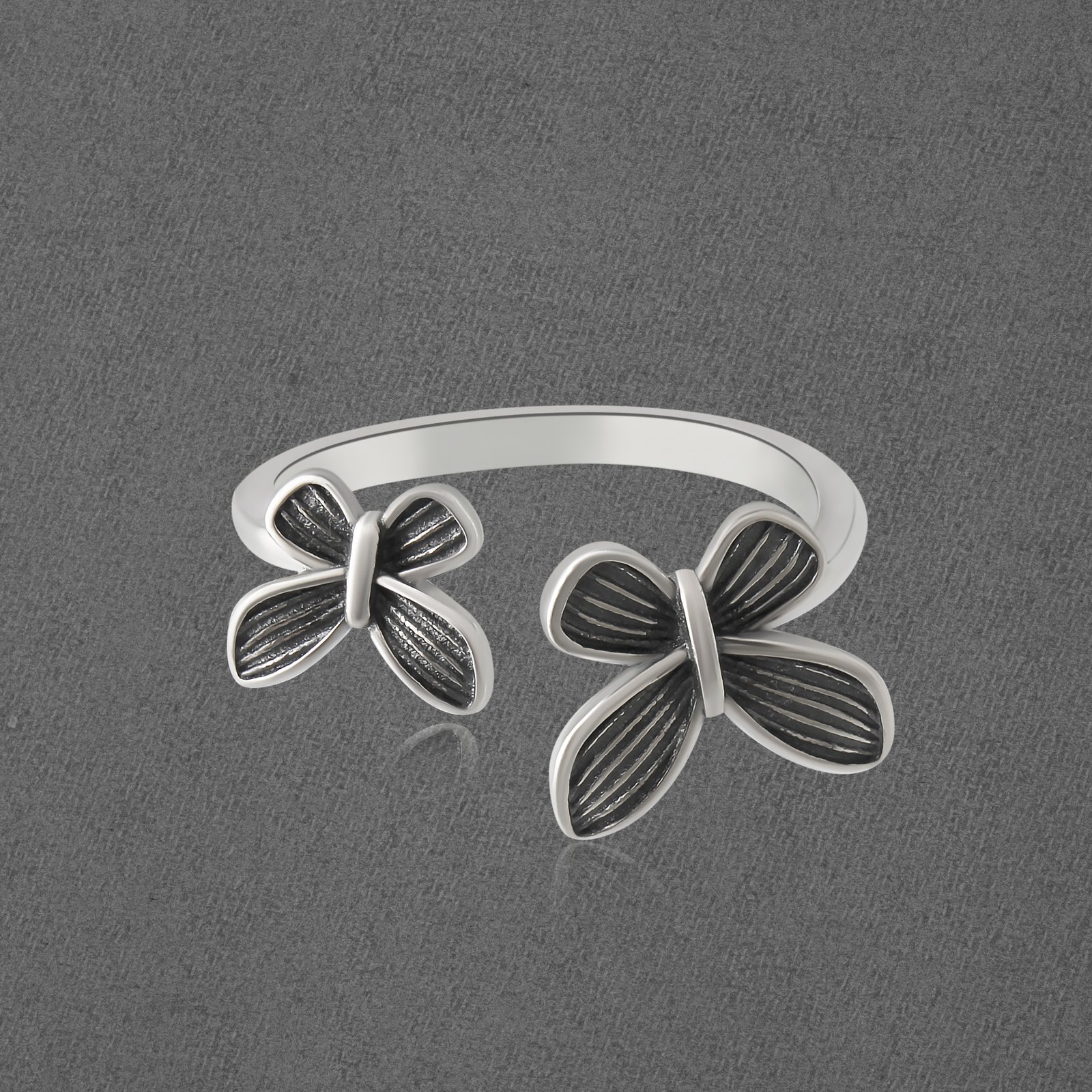 The oxidized finish highlights the textured details of the bows, creating a vintage-inspired look that stands out. The open-ended adjustable design ensures a comfortable fit, making it ideal for all-day wear or as a thoughtful gift for someone special.