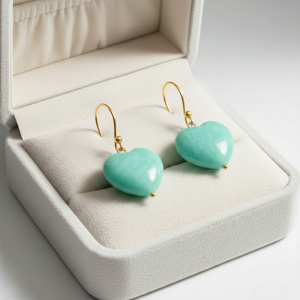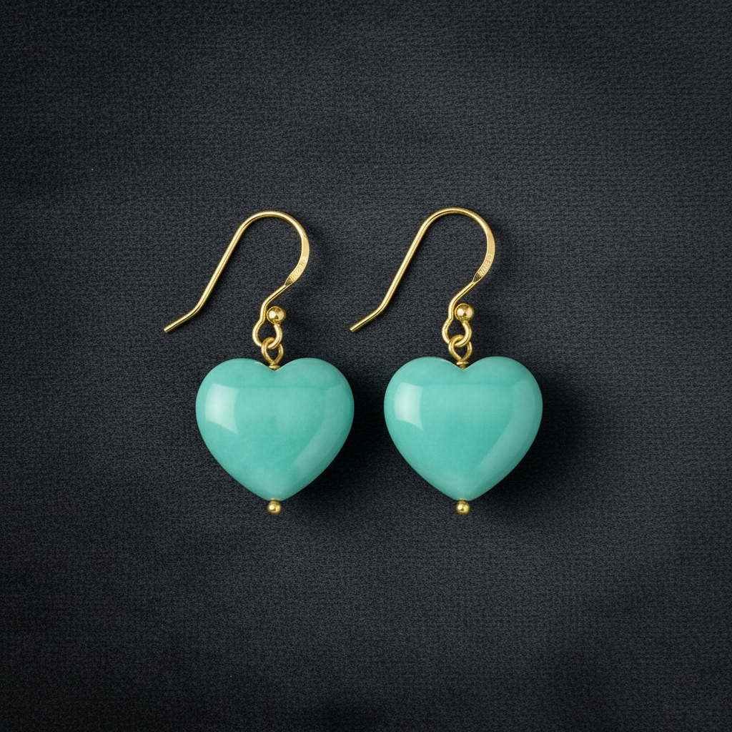 Elegant heart-shaped Amazonite drop earrings with a soft, soothing sea-green color