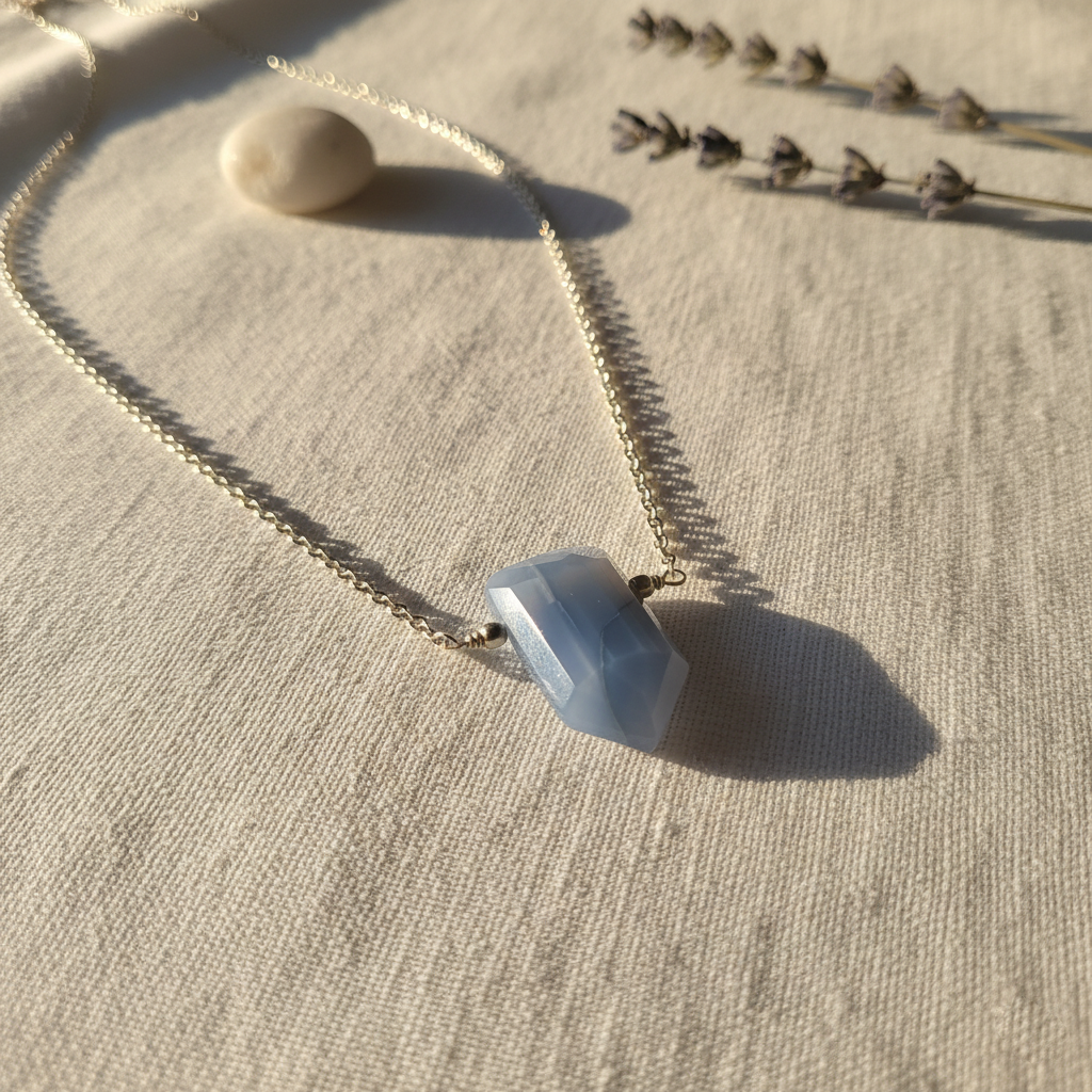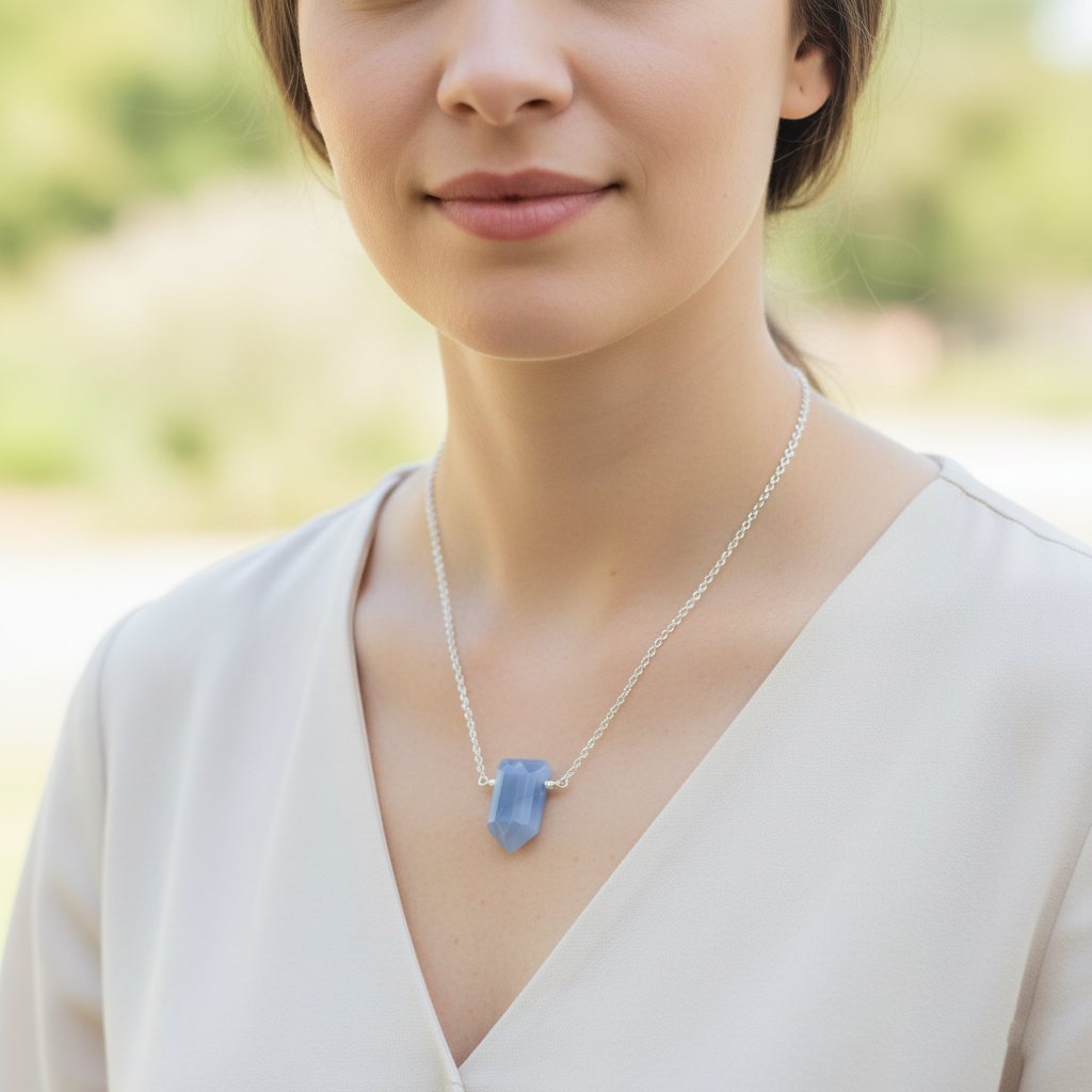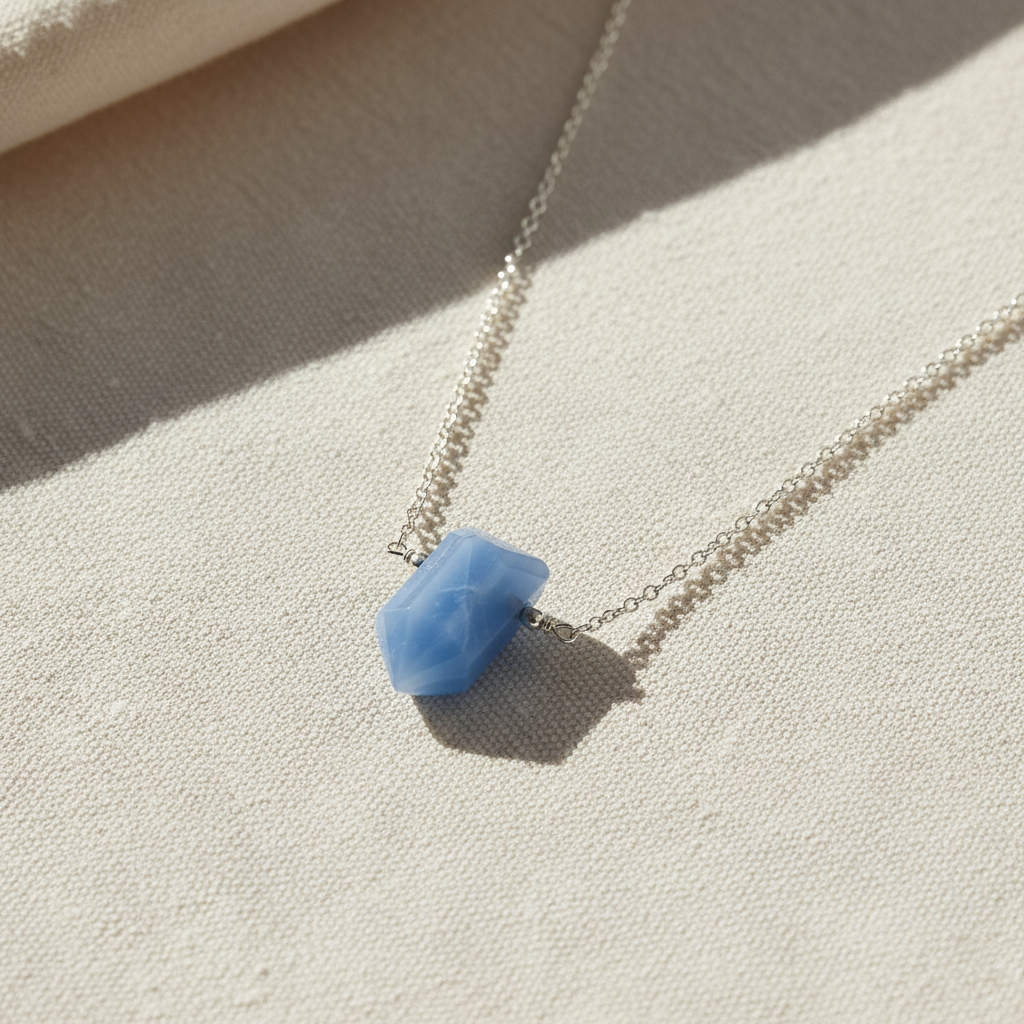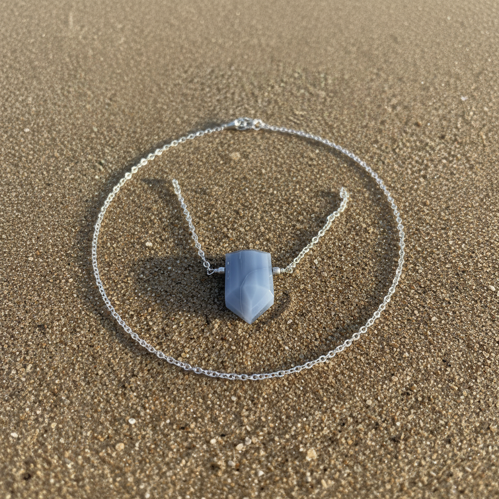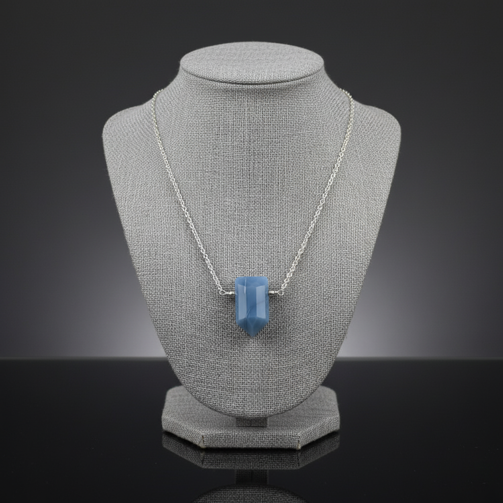 - This stunning Blue Opal Point Necklace features a faceted, shield-shaped blue opal gemstone suspended on a delicate sterling silver cable chain. The soft, dreamy blue hues of the opal make it a versatile everyday piece that pairs beautifully with both casual and formal looks.