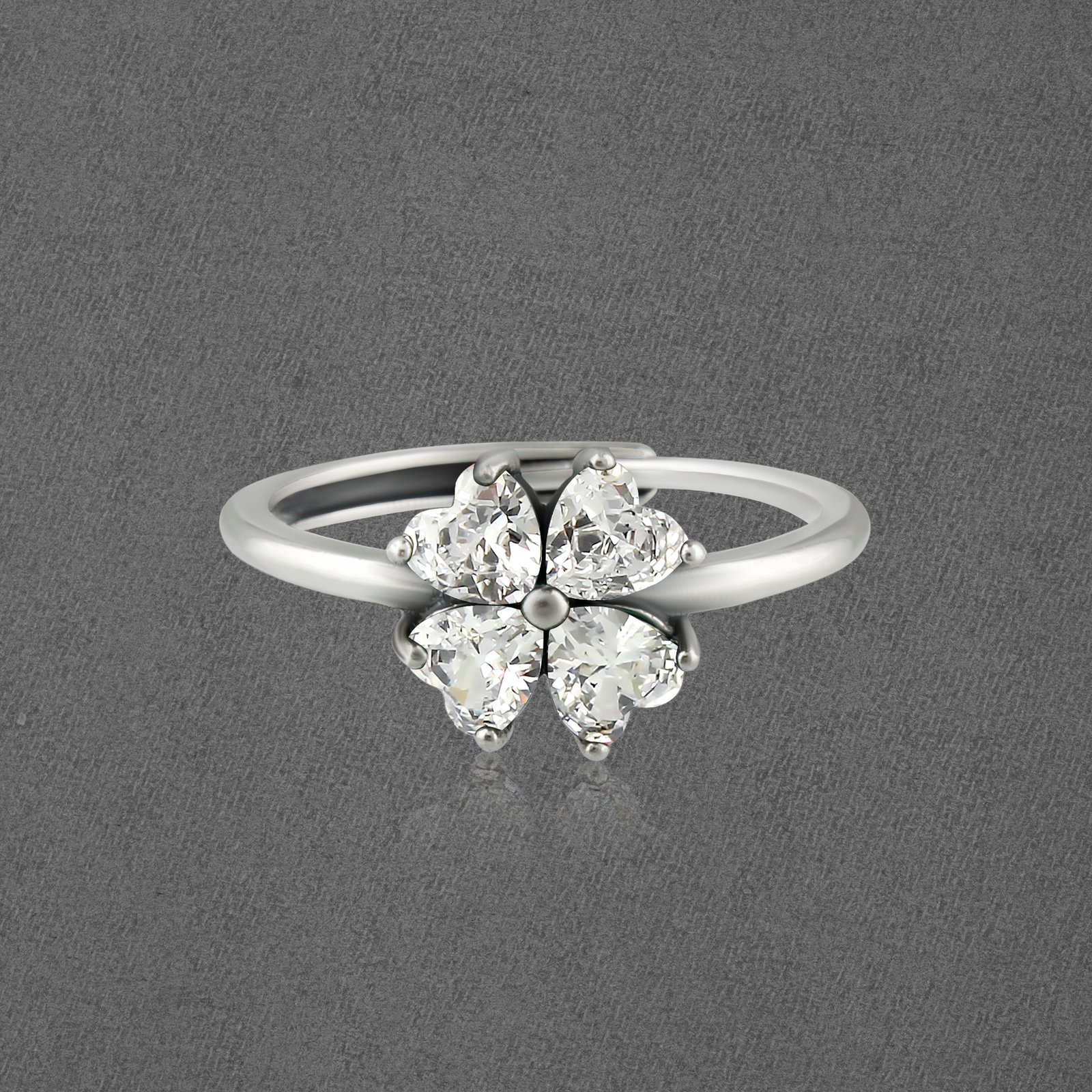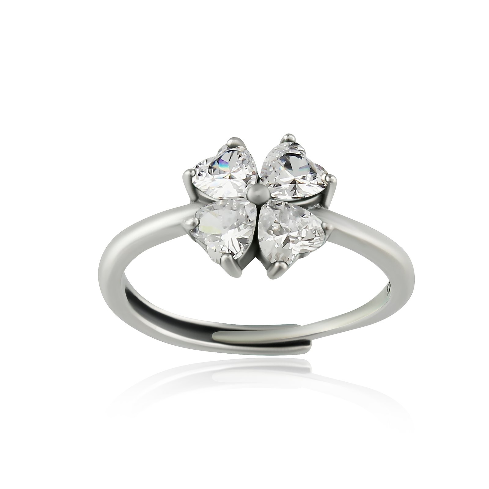 Elegant Adjustable Sterling Silver Ring with Four Heart-Shaped White Cubic Zirconia Stones in a Clover Design