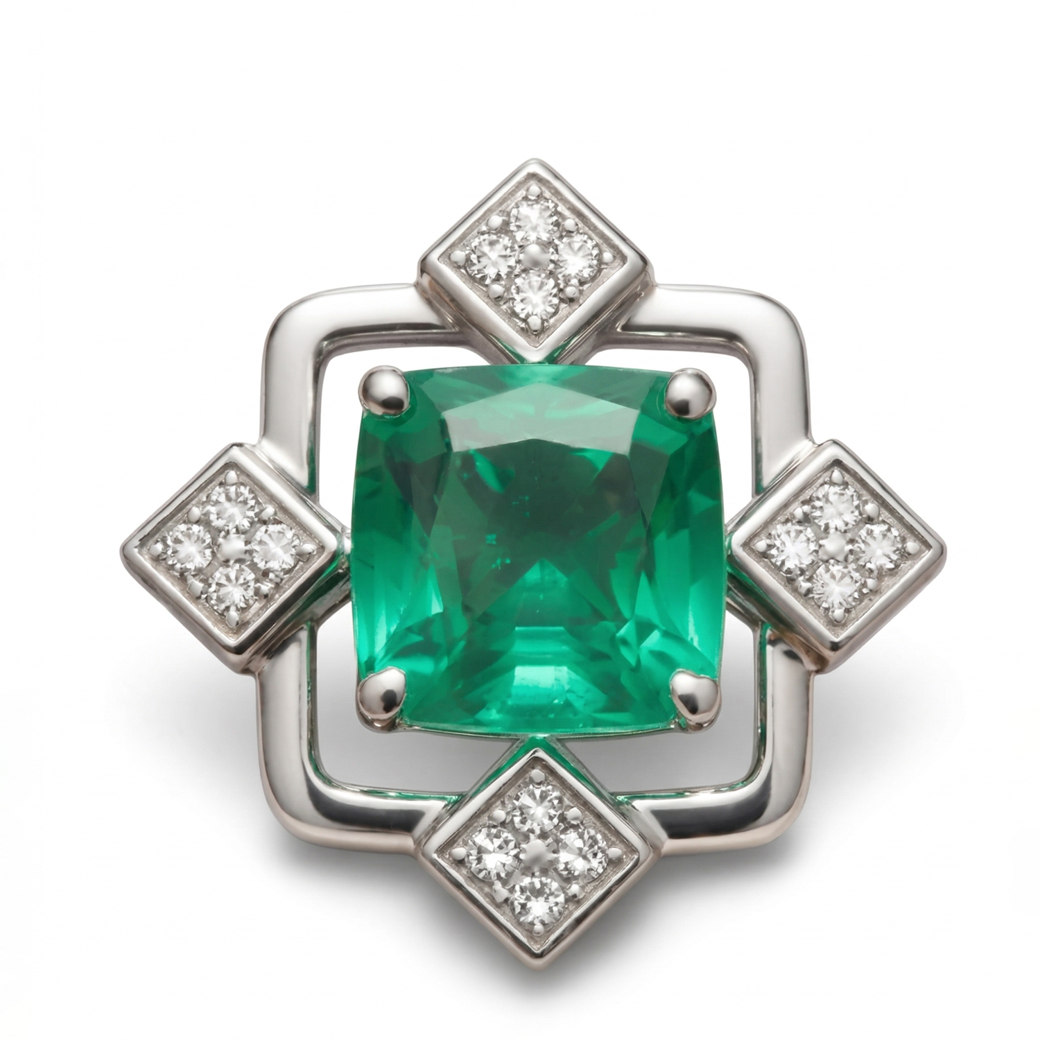 • Elegant brooch-style pendant featuring a large cushion-cut emerald green gemstone as the center piece, surrounded by a geometric white metal frame in a four-pointed star motif