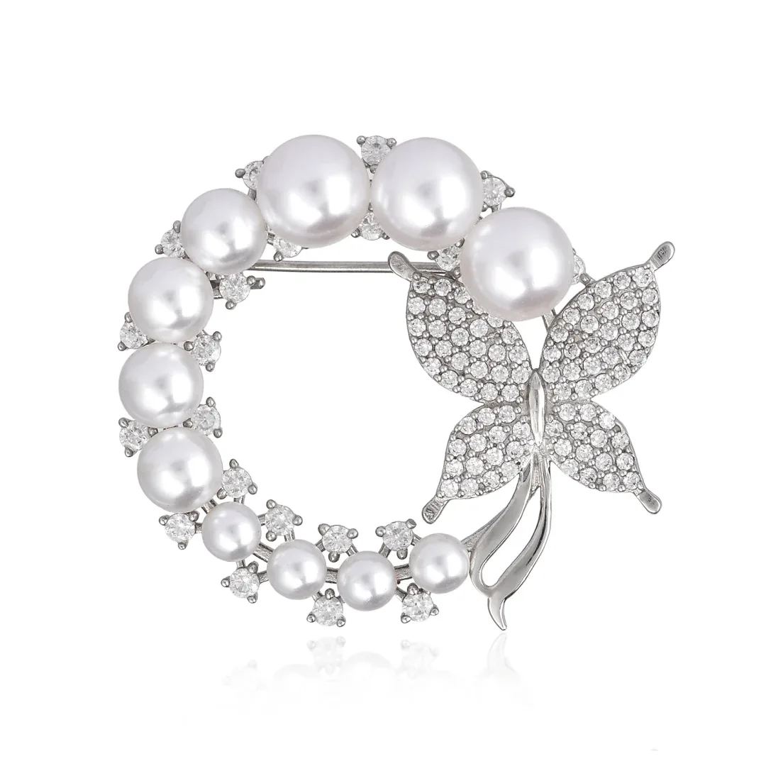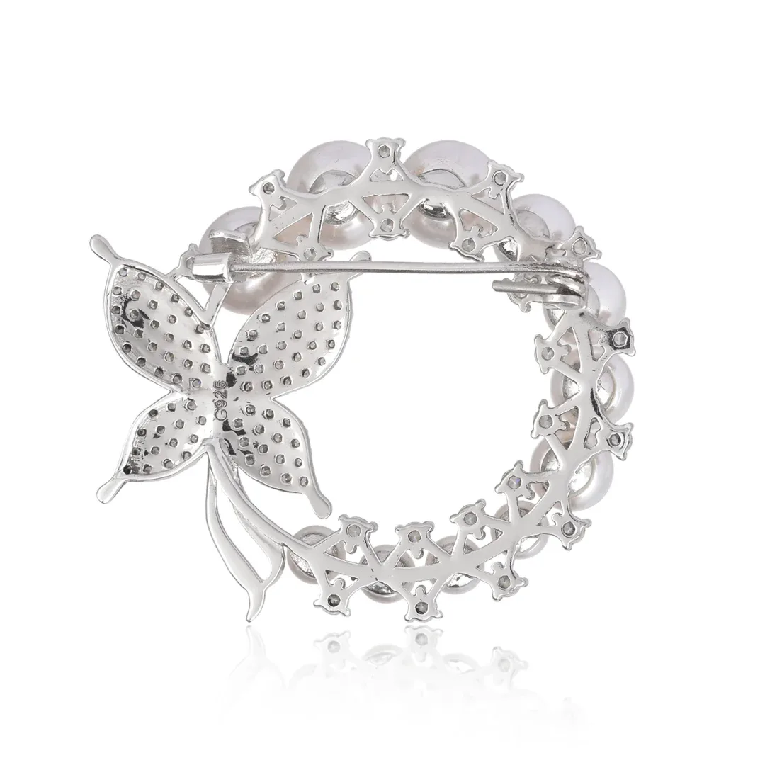 This stunning brooch features a harmonious blend of classic elegance and modern sophistication, making it a versatile accessory for any occasion. Crafted from high-quality sterling silver, this piece boasts an intricate design that highlights the natural beauty of freshwater pearls and the dazzling sparkle of pave diamonds. The brooch showcases a circle of 11 lustrous white pearls, each perfectly round and highly polished to enhance their natural iridescence. These pearls vary slightly in size, adding a dynamic and organic flow to the design. Surrounding the pearls are clusters of pave-set diamonds, delicately embedded into the metal. These diamonds, with their brilliant-cut facets, add an extra layer of sparkle, making the brooch shimmer under any light. The alternating pattern of pearls and diamonds exudes sophistication and draws the eye to its centerpiece: a beautifully crafted butterfly. The butterfly, located on the right side of the brooch, is composed of pave-set diamonds, intricately arranged to create an enchanting, winged motif. The wings are slightly curved, giving the butterfly a sense of movement and life. The fine detailing of the butterfly, from the tiny diamonds forming its body to the carefully sculpted silver antennae, adds a touch of whimsy and grace to the overall design. Its wings extend slightly beyond the pearl circle, creating a balance between the geometric and organic elements of the piece. Measuring approximately 2 inches in diameter, this brooch is the perfect size to make a statement without being overpowering. Its secure pin fastening ensures it stays in place, whether worn on a jacket lapel, scarf, or evening gown. The combination of pearls, diamonds, and the nature-inspired butterfly motif makes this brooch a timeless treasure, suitable for formal events, weddings, or even as an heirloom piece. Ideal as a gift for a loved one or a treat for yourself, this brooch is a celebration of elegance, craftsmanship, and nature?s beauty. Each detail is designed to captivate, making it a truly unforgettable accessory.