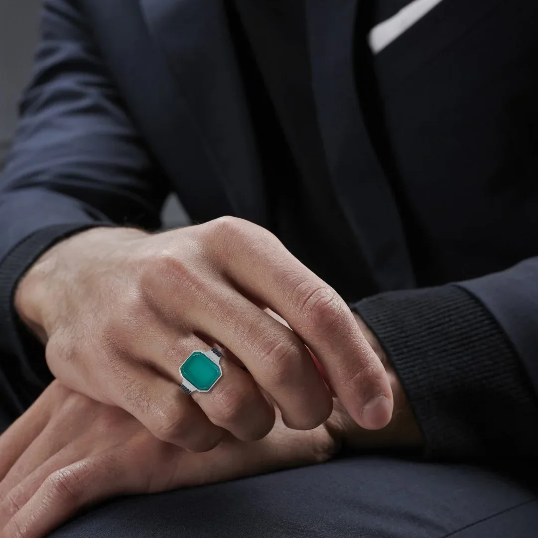 The design is meticulously crafted, with a rounded top that showcases the Green Agate in all its splendor. Its brushed finish adds a touch of sophistication, making it a versatile accessory that seamlessly transitions from formal occasions to casual outings. Whether you’re donning a business suit or your favorite streetwear ensemble, this ring elevates your look effortlessly.