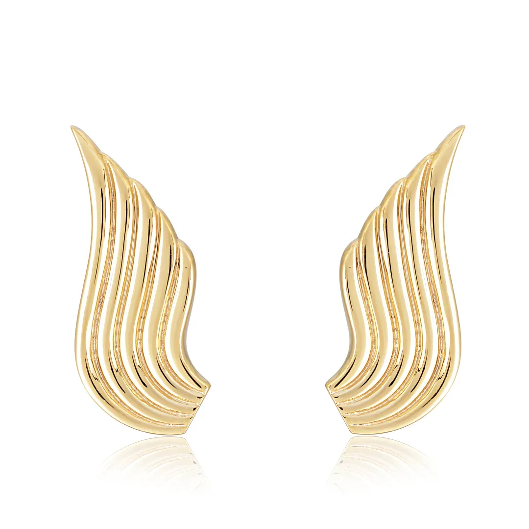 The design of these earrings features intricately detailed angel wings, symbolizing purity, protection, and divine inspiration. Each wing is meticulously shaped to mimic the delicate, feather-like texture of real angel wings, providing a graceful and airy appearance. The gold plating enhances the overall elegance of the design, offering a warm and luxurious finish that catches the light beautifully.
