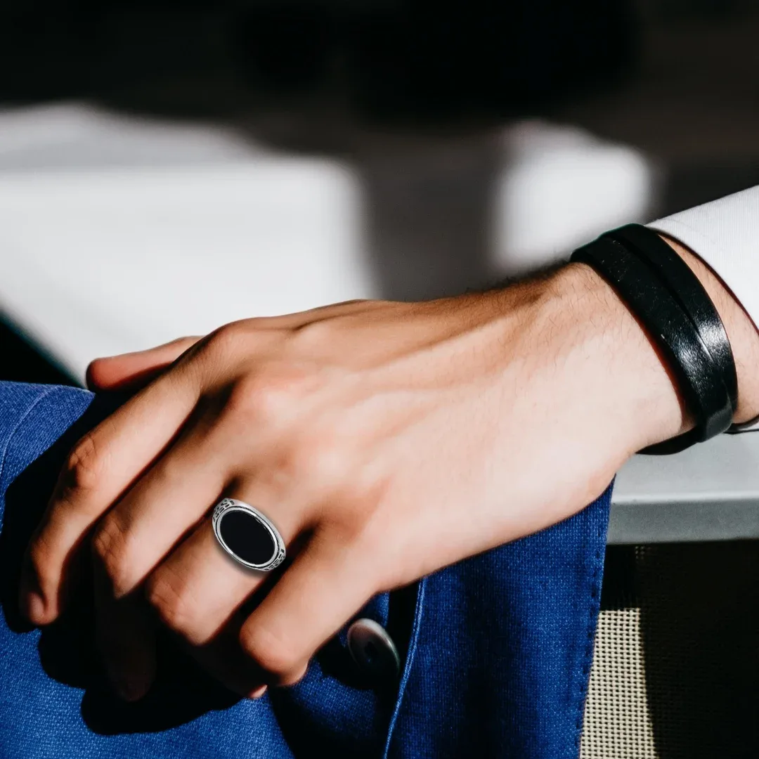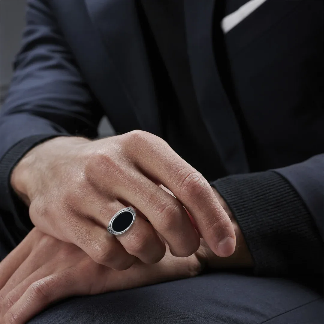 Black Onyx has a timeless appeal associated with luck and positive energies. Crafted meticulously in durable, tarnish-resistant silver, this men?s ring is designed to withstand the test of time. Versatility is its forte ? this ring effortlessly complements your business attire, adding a dash of refined elegance. Simultaneously, it seamlessly blends with your streetwear, elevating your casual look with its understated yet impactful presence.