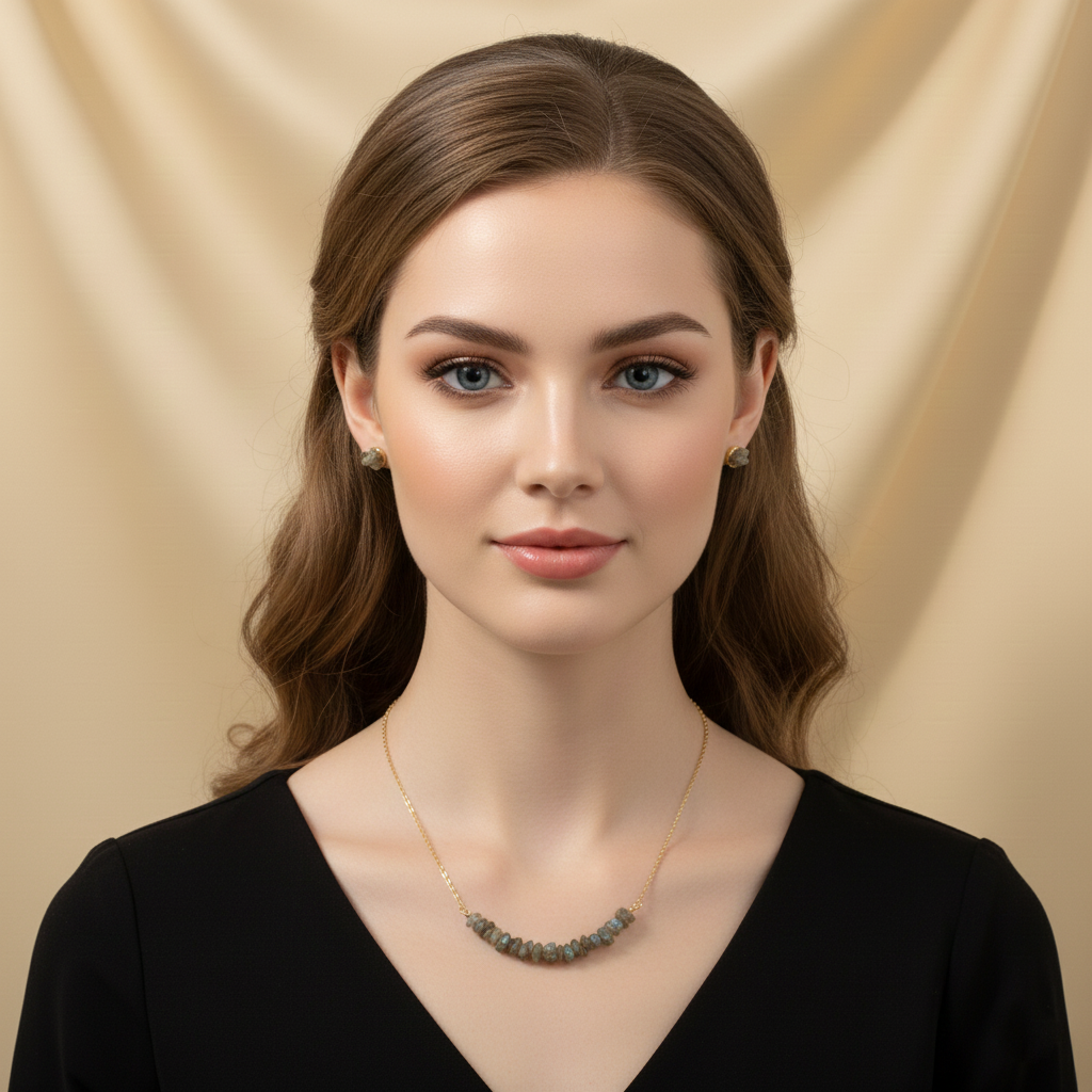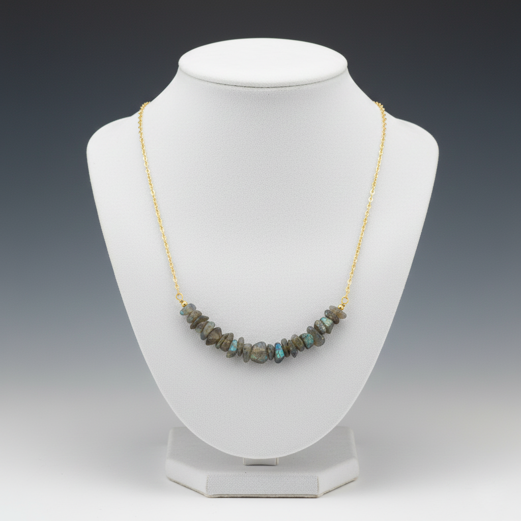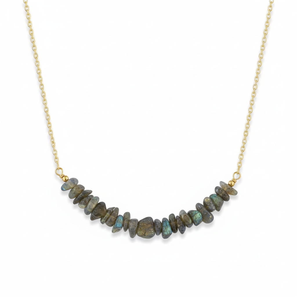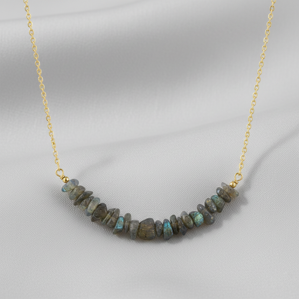 - Material: Genuine natural labradorite chip beads on high-quality gold-plated brass cable chain