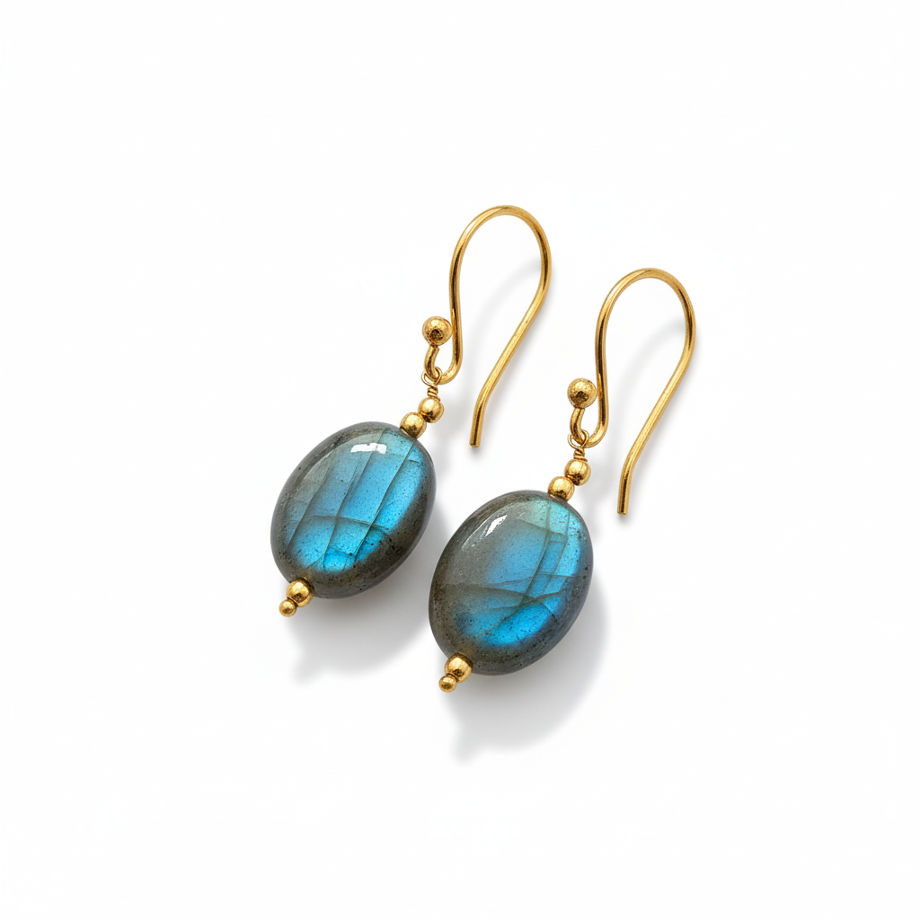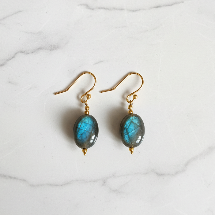 Elegant drop earrings featuring natural oval Labradorite gemstones with beautiful blue iridescent flashes