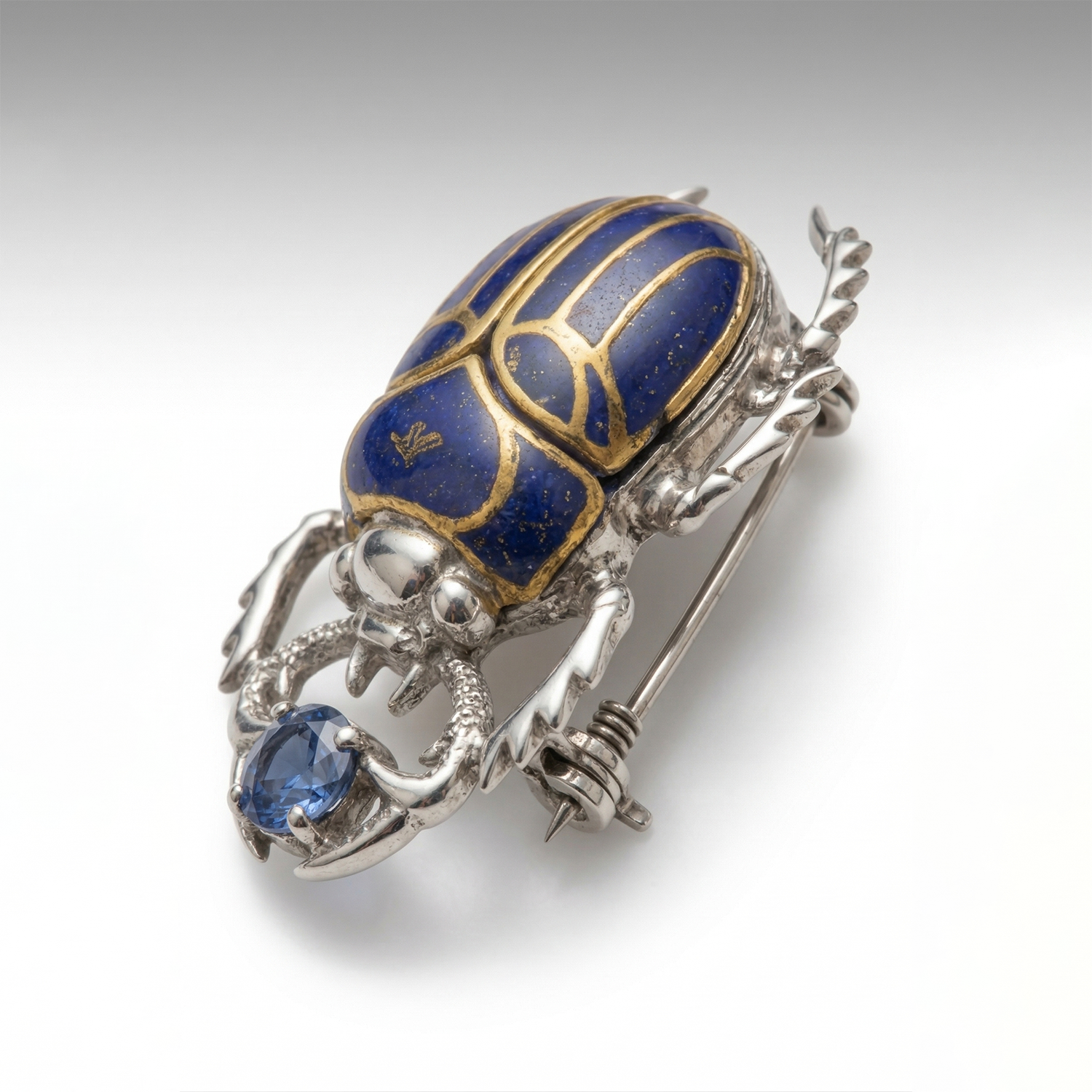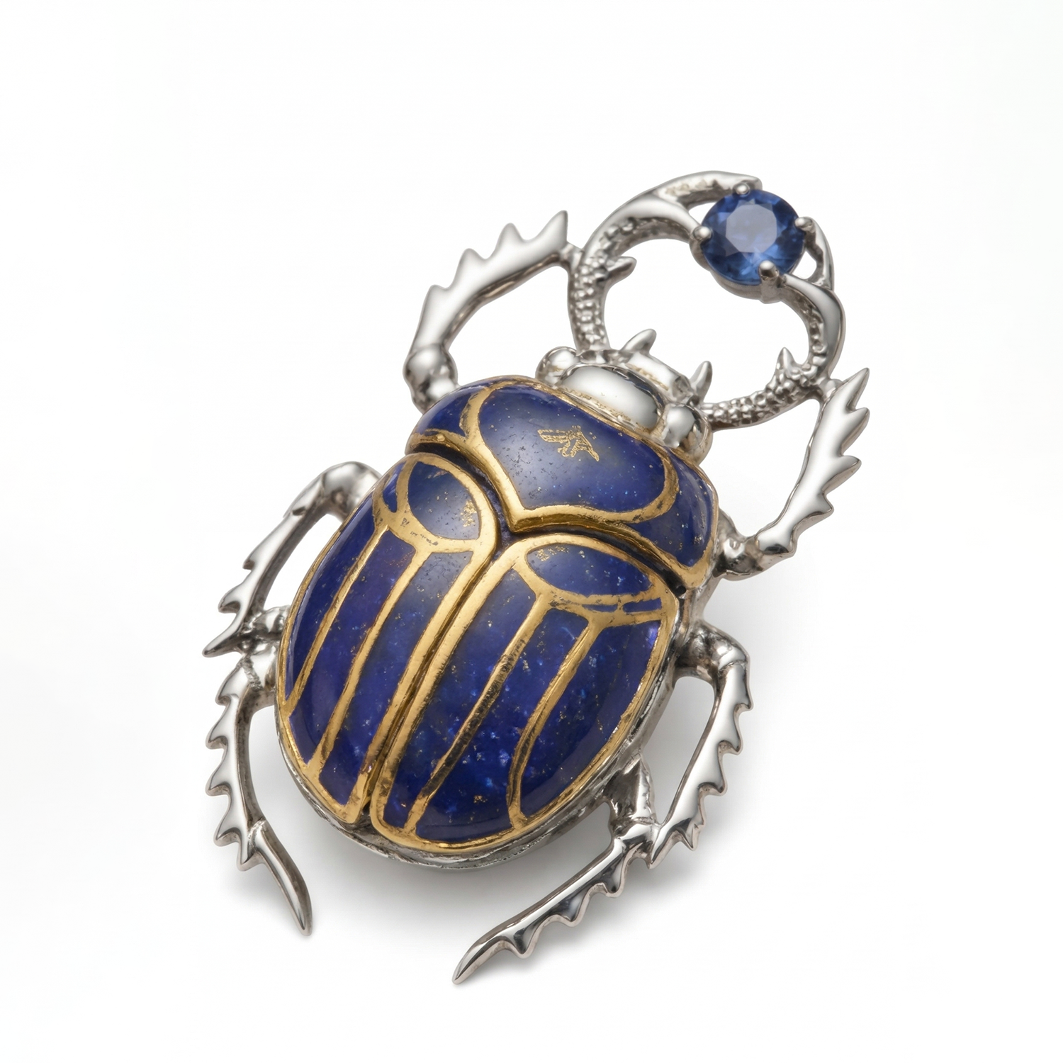 Elegant scarab lapel brooch crafted with deep blue Lapis Lazuli and intricate gold detailing on a polished silver base. Lightweight, durable, and designed for a premium look, it symbolizes wisdom, confidence, and inner strength—perfect for stylish everyday wear or gifting.