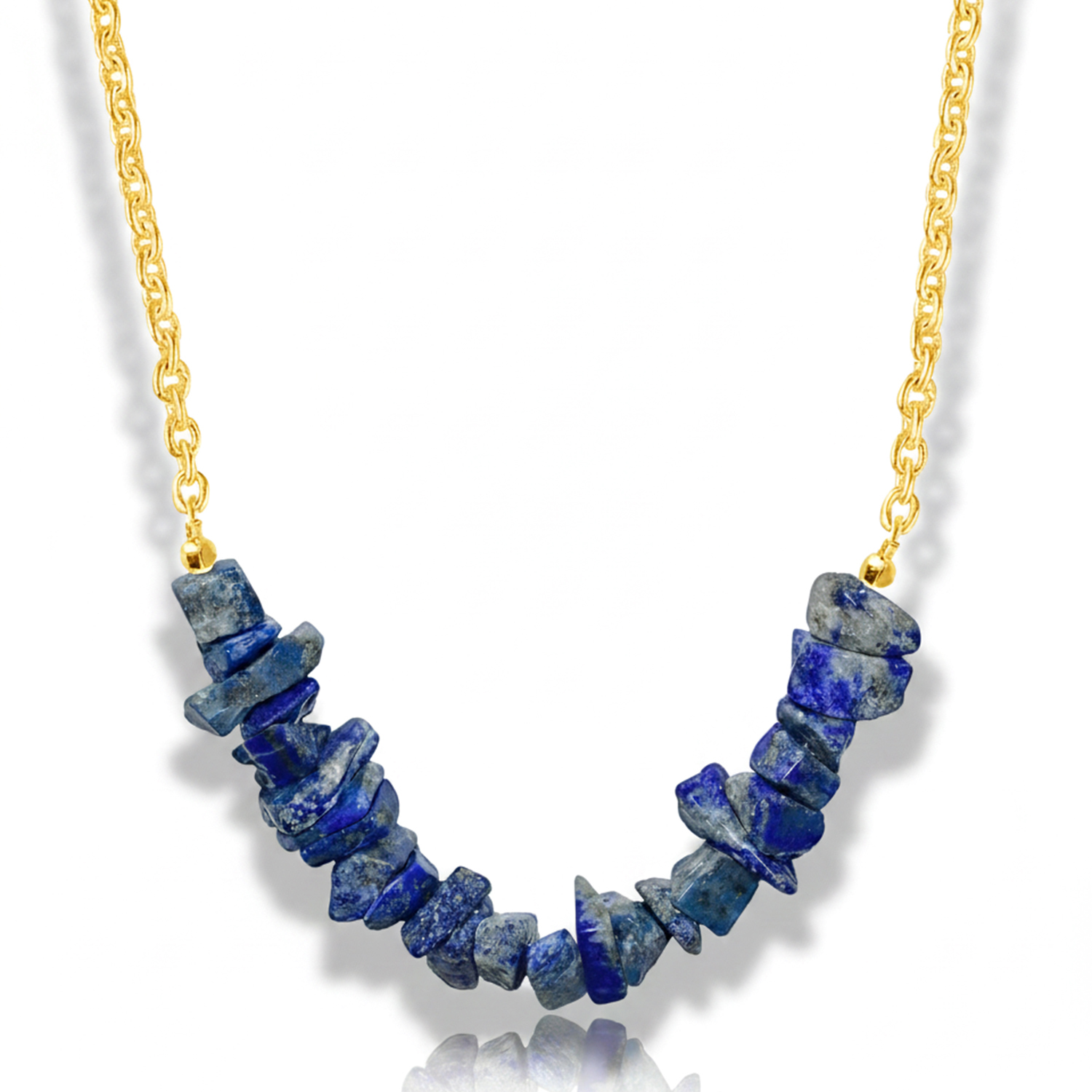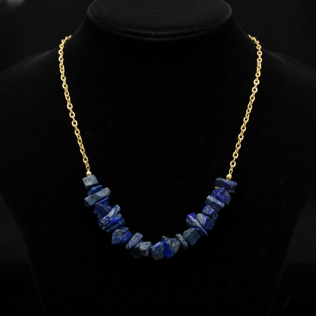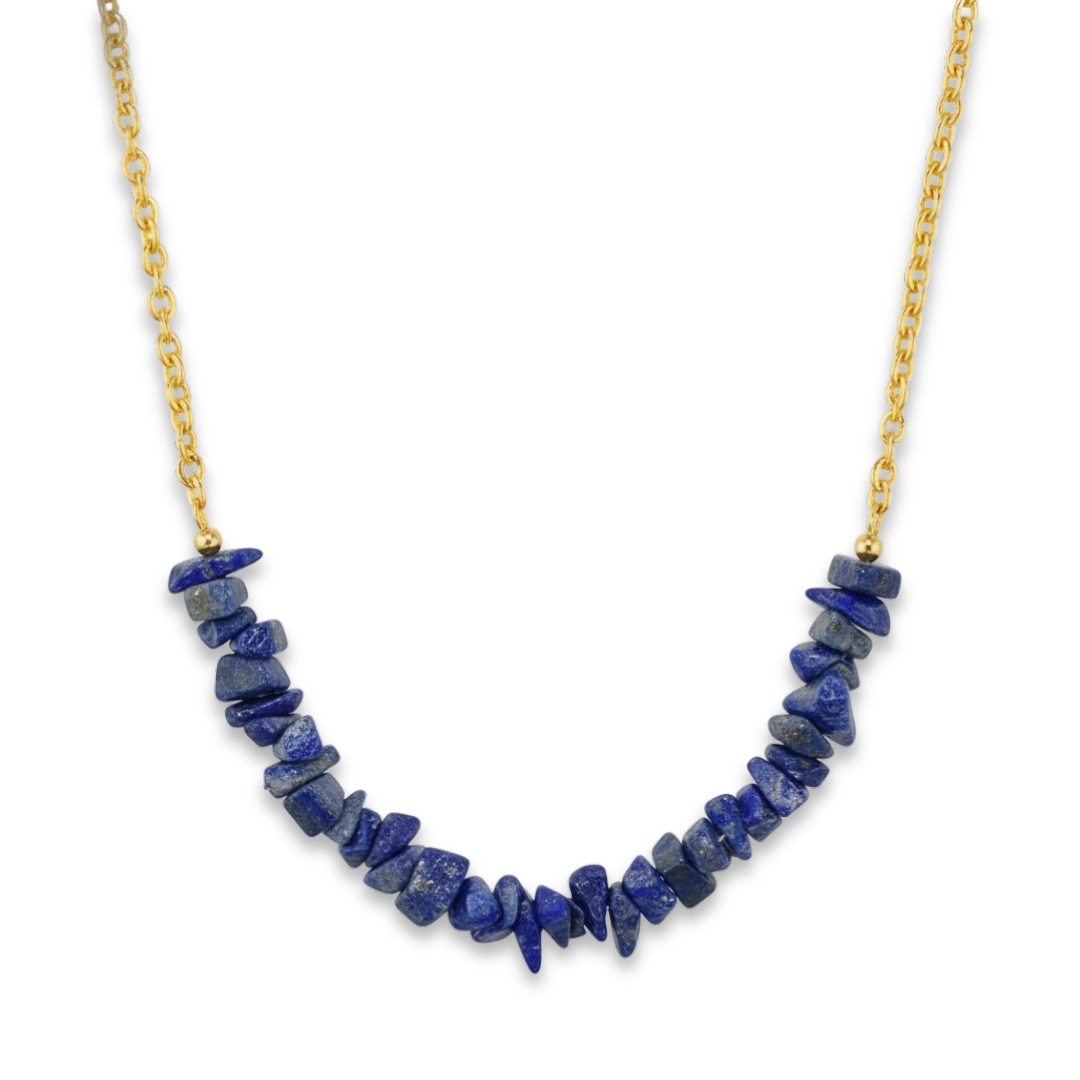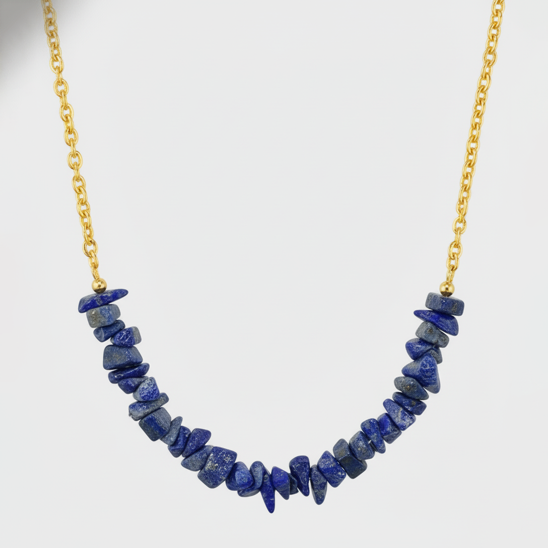 - Elegant bar-style necklace featuring raw natural lapis lazuli chip beads arranged in a graceful arc design