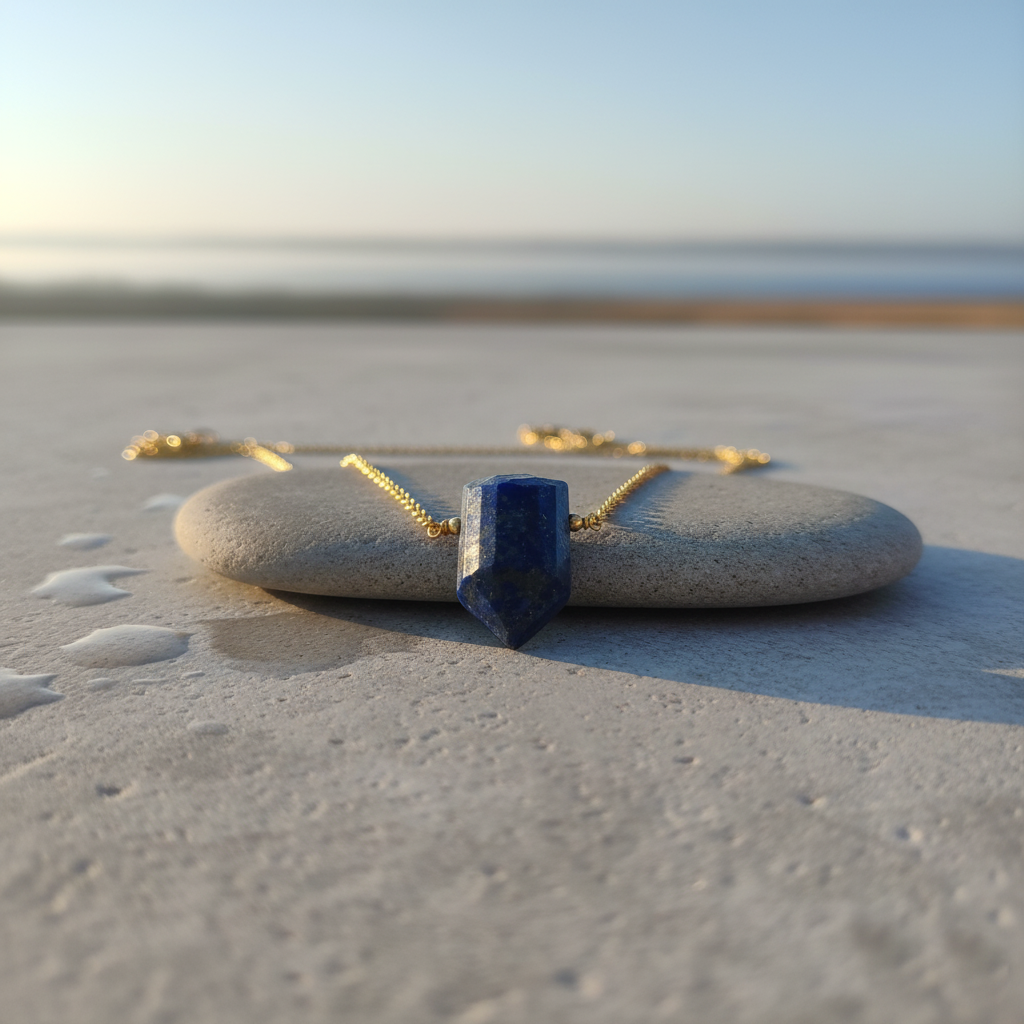 - Discover timeless elegance with this handcrafted Lapis Lazuli Crystal Point Pendant Necklace. The deep royal blue stone, naturally flecked with golden pyrite, is shaped into a bold faceted point and suspended on a fine 18K gold-plated chain — perfect for everyday wear or special occasions.