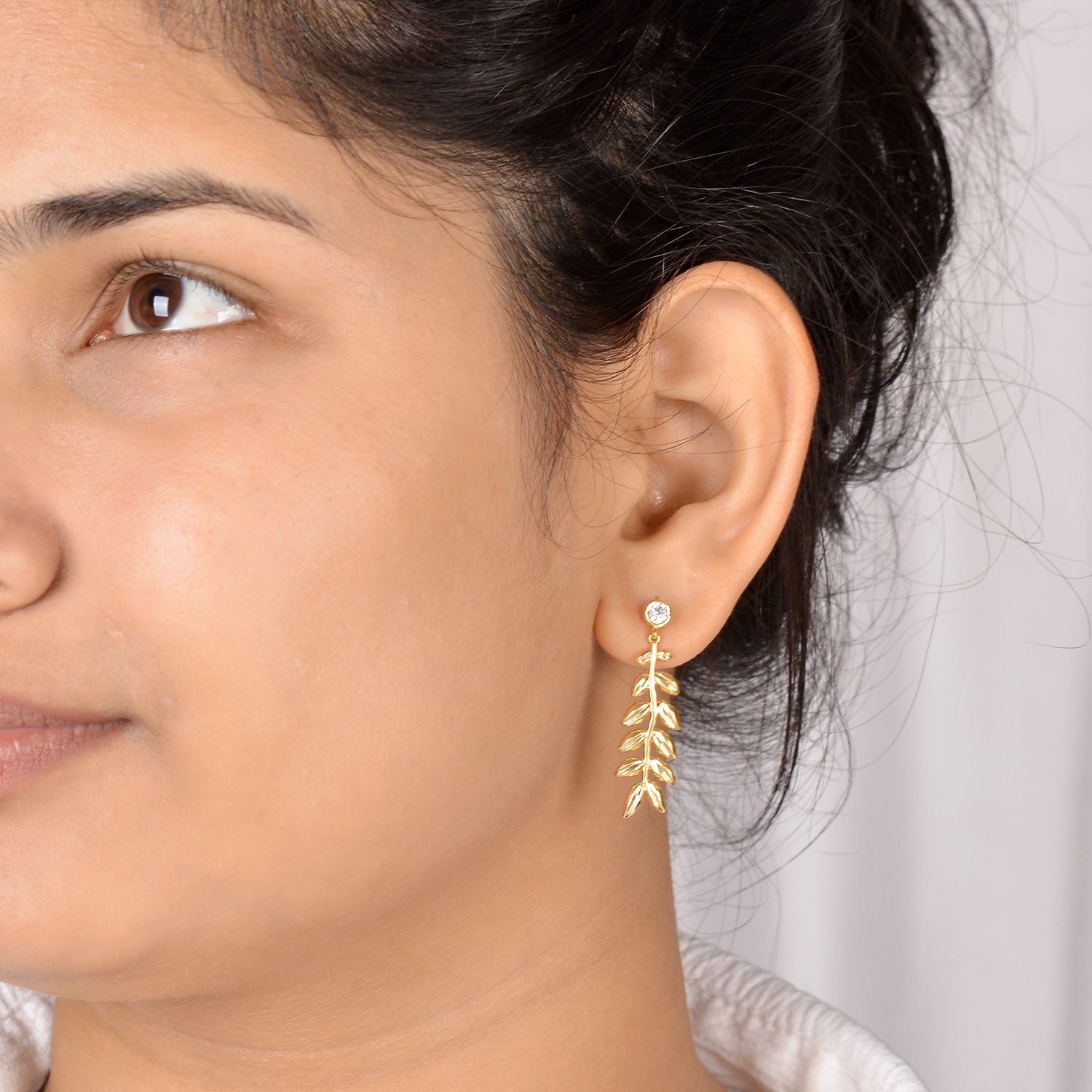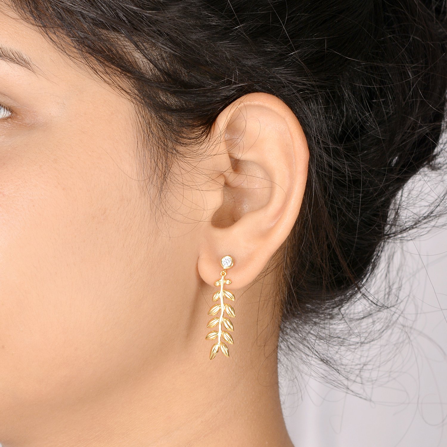 Crafted from high-quality materials, these earrings feature an intricate gold-plated design that exudes luxury and refinement. The main highlight of the earrings is the gracefully detailed leaf components. Each leaf is meticulously shaped and etched to capture the intricate veins and natural texture, giving them an authentic, organic look. The gold plating enhances the overall elegance, providing a warm, radiant finish that catches the light beautifully.