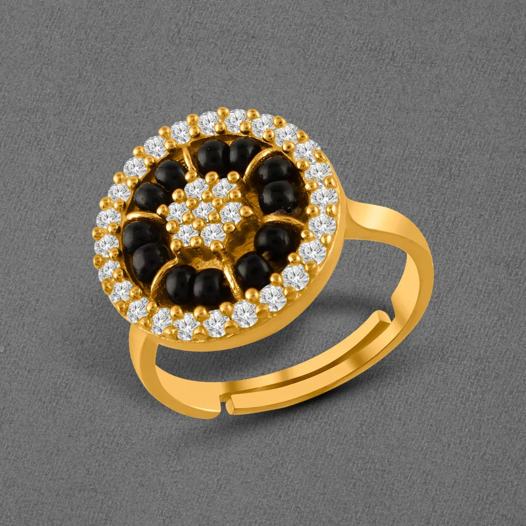 The design boasts a captivating blend of black and gold shades, seamlessly merging to create a beautiful contrast that adds a touch of sophistication. Furthermore, to enhance its elegance, the ring is adorned with sparkling American diamonds, infusing it with a touch of glamour and brilliance. Whether worn on its own or paired with other accessories, this ring is a radiant expression of timeless style and refinement.