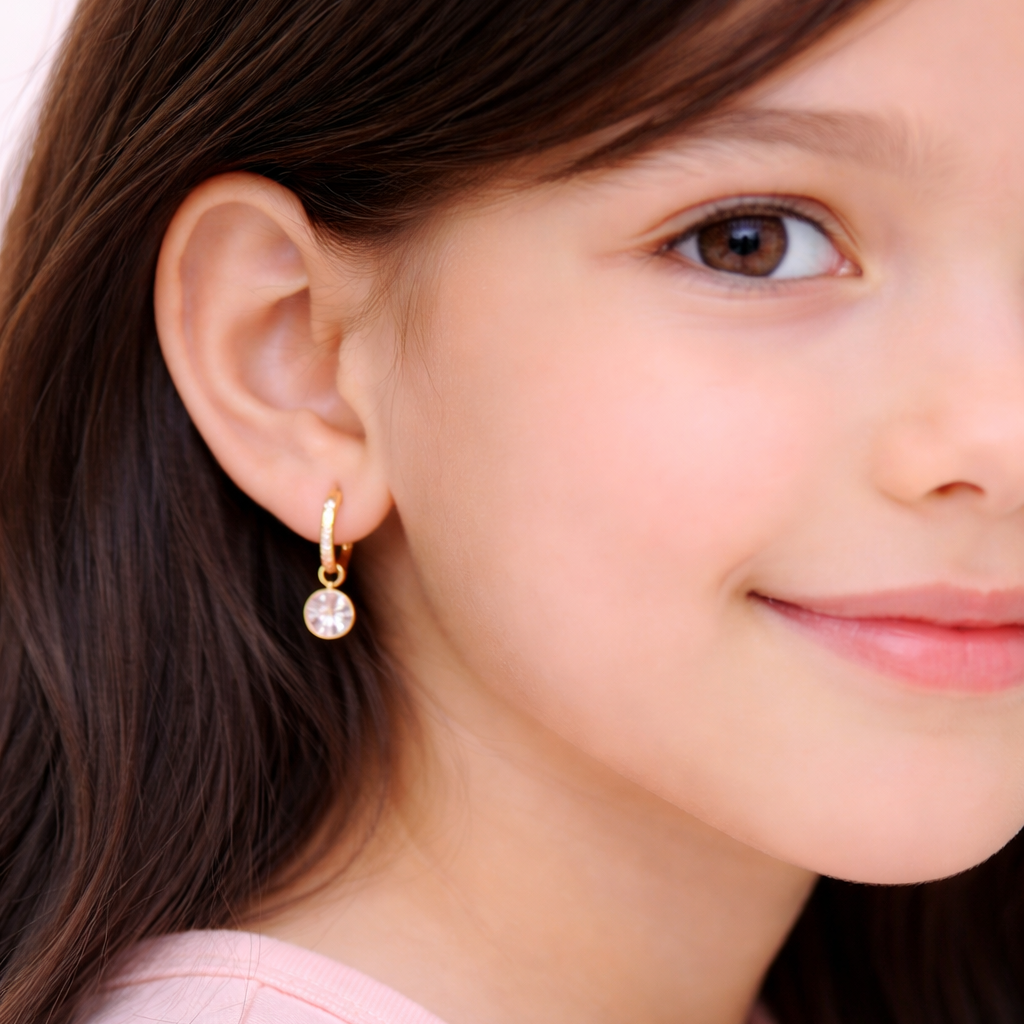 A delicate huggie hoop earring featuring a pavé moissanite band and a sparkling solitaire drop charm, crafted in 925 sterling silver with 18K gold plating. Hypoallergenic, brilliant, and perfect for everyday and special occasion wear.