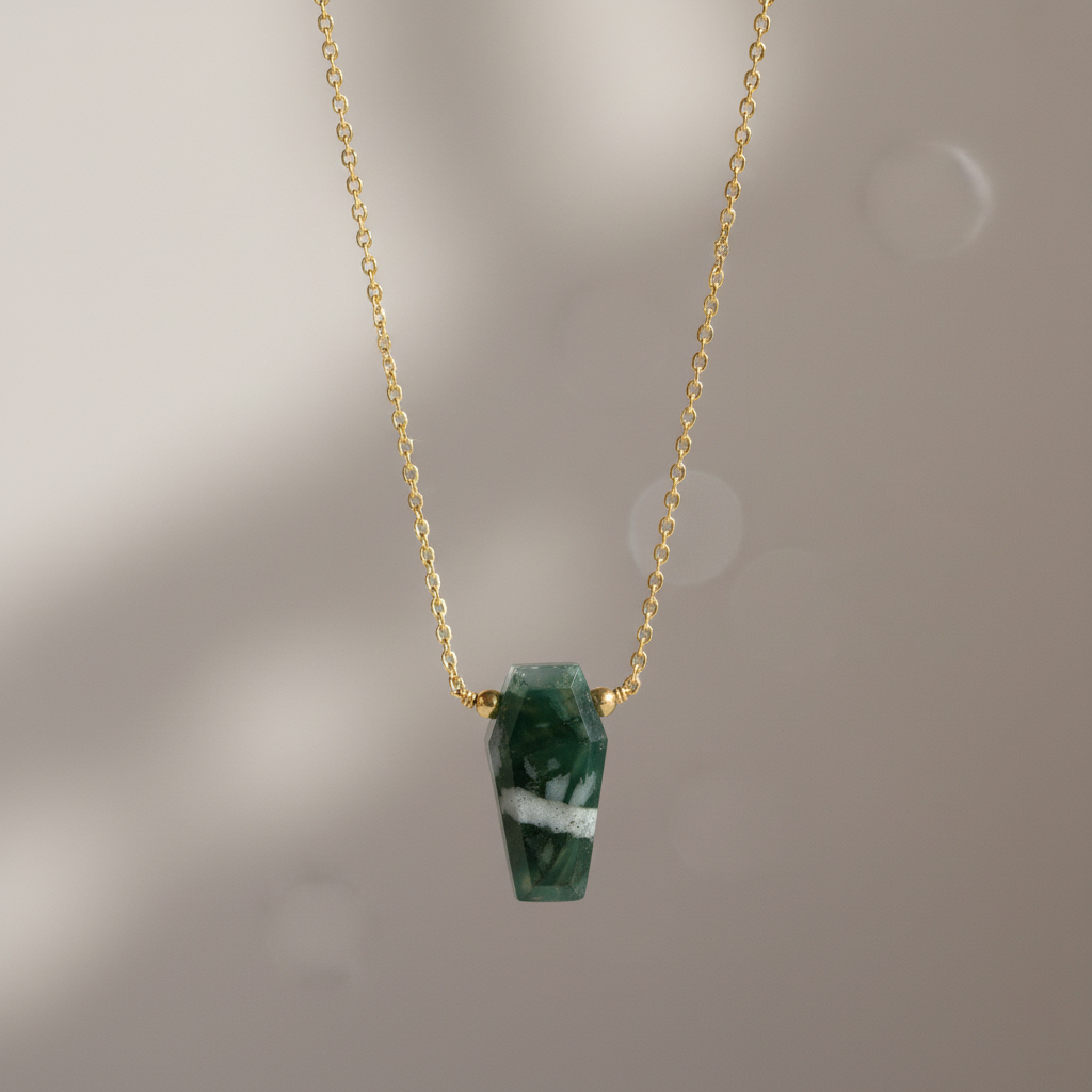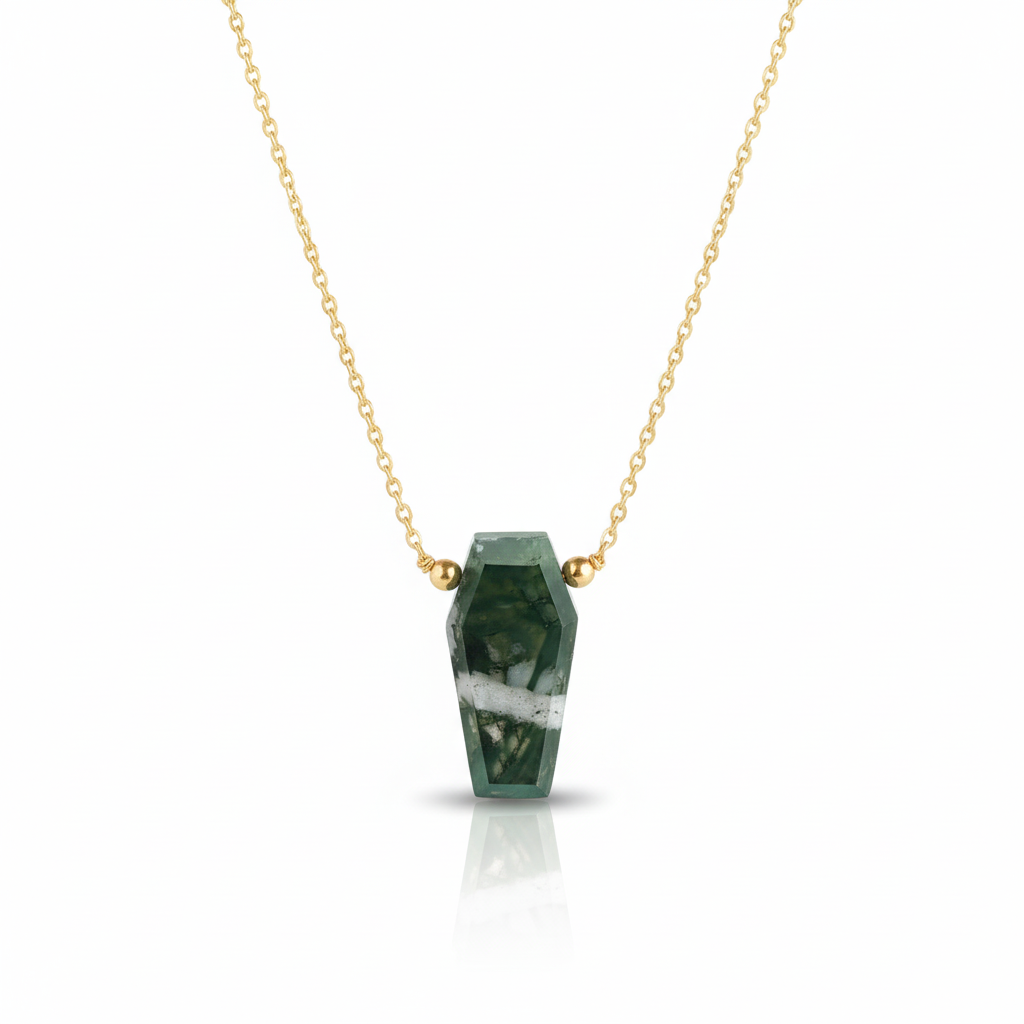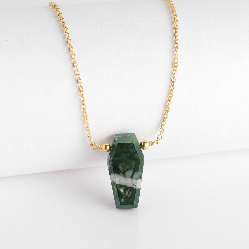 - Elegant Product Overview: This Moss Agate Coffin Pendant Necklace features a unique geometric coffin-cut gemstone showcasing natural green inclusions and earthy patterns. Its minimalist yet mystical design makes it perfect for everyday wear, layering, or spiritual jewelry styling, adding a modern statement to both casual and formal outfits.
