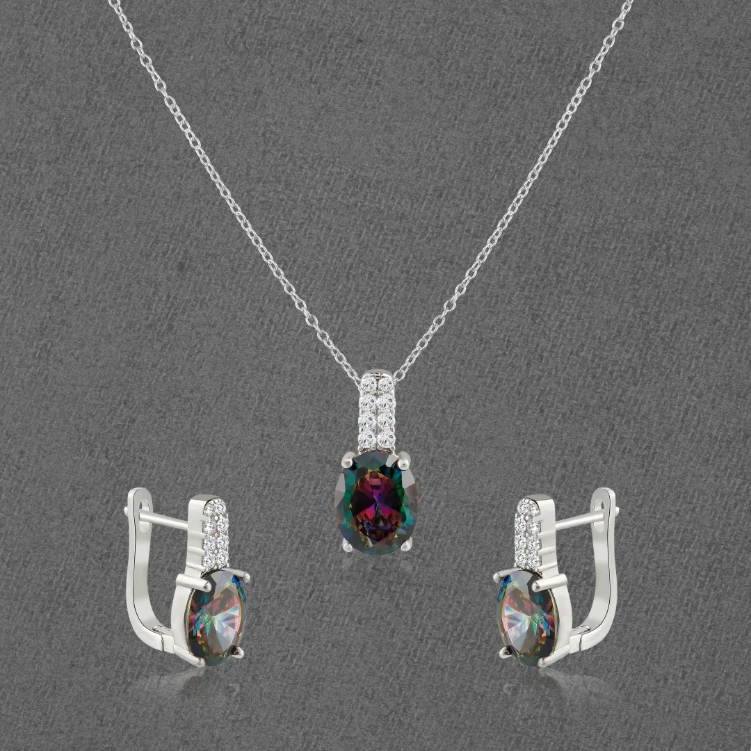 Unleash your inner magic with our 925 sterling silver Mystiq Quartz necklace and earrings set. This enchanting duo features captivating rainbow hues that dance and shimmer, making you the center of attention. Elevate your style with this exquisite, handcrafted masterpiece.