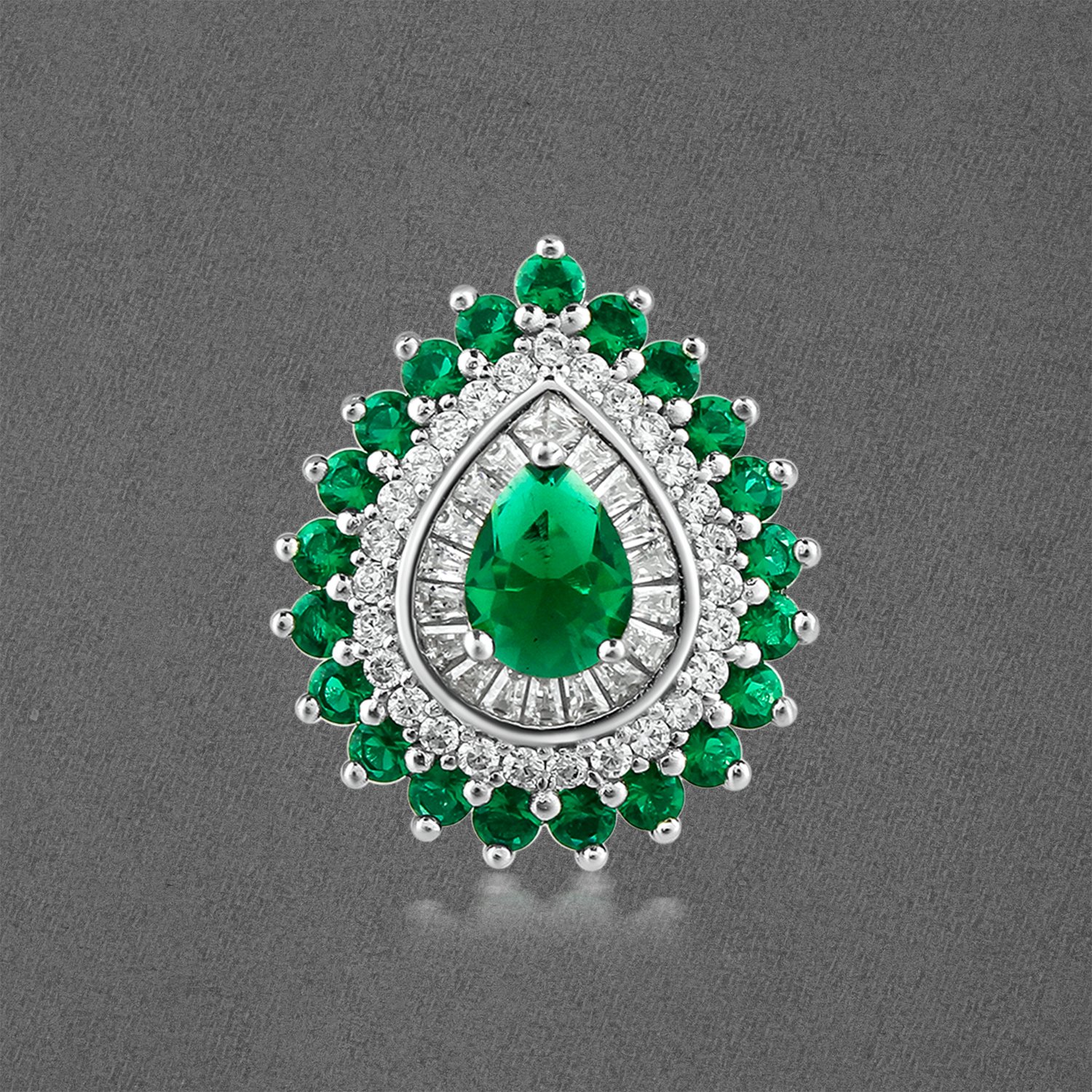 - Features a stunning, handpicked pear-shaped emerald known for its vibrant green hue and exceptional clarity.