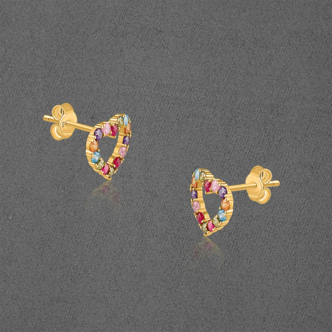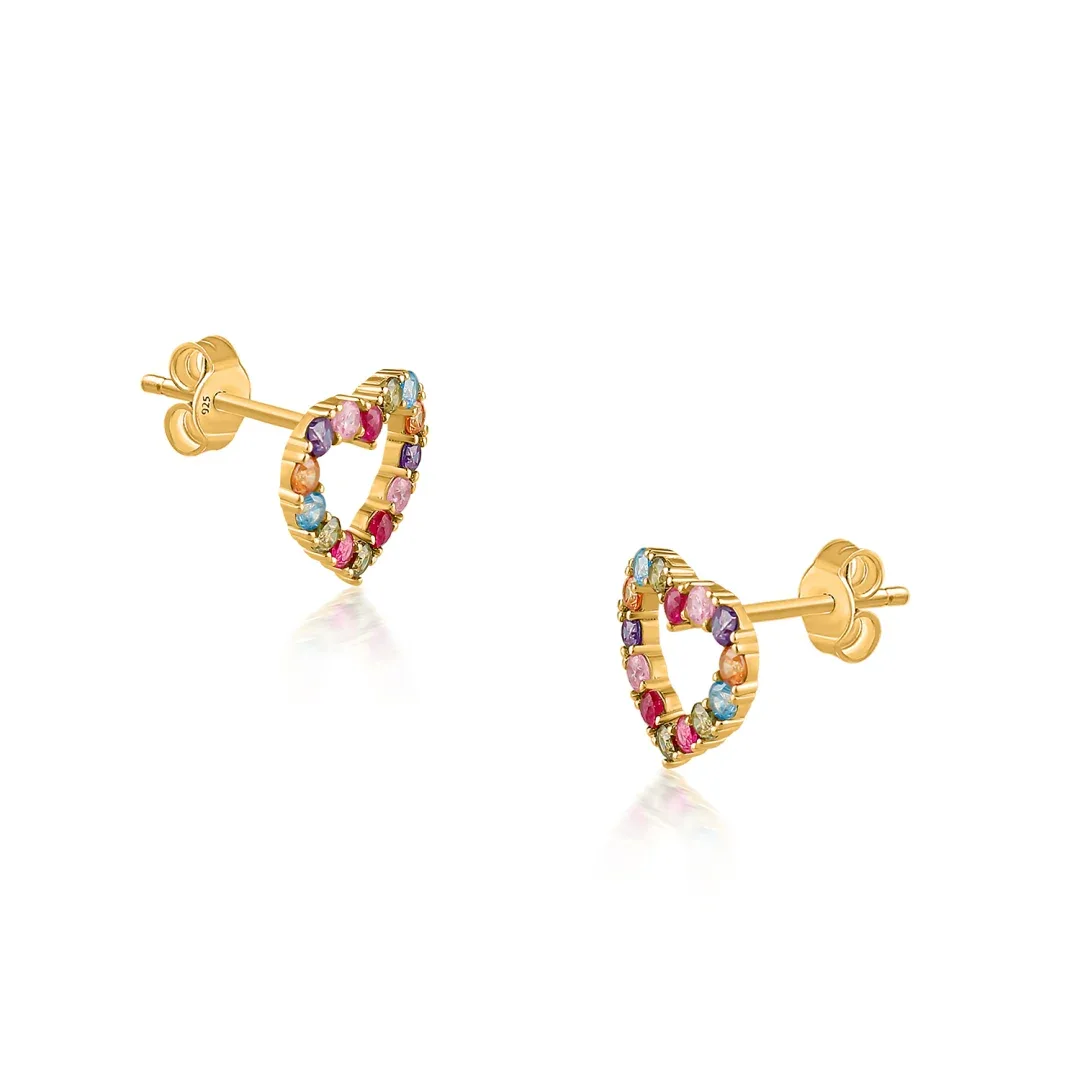 Each earring features a delicate heart-shaped outline adorned with a variety of meticulously selected stones. These stones are expertly set in a prong setting, ensuring maximum sparkle and stability. The rainbow of colors in the gemstones creates a captivating and eye-catching effect, making these earrings perfect for adding a pop of color to your look.