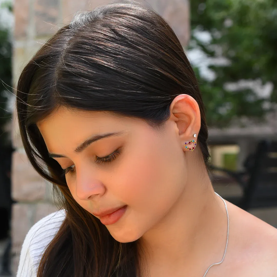 Introducing our exquisite Heart-Shaped Multi-Stone Stud Earrings, a stunning blend of elegance and vibrant color that adds a touch of glamour to any outfit. These earrings are meticulously crafted from high-quality 925 Sterling Silver, providing a lustrous and durable setting that enhances the brilliance of the Stones.