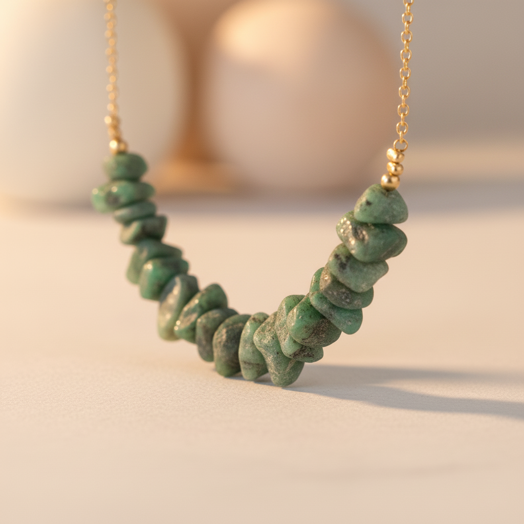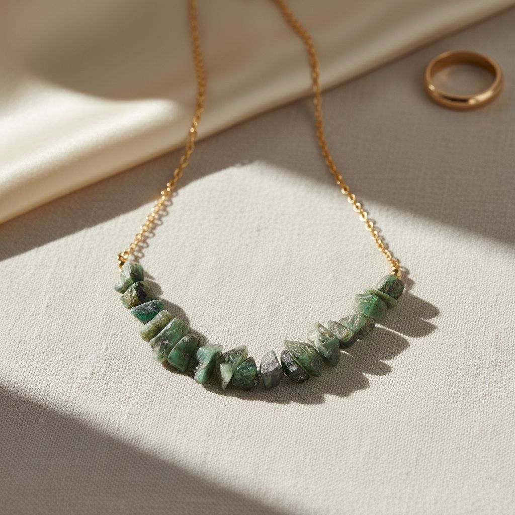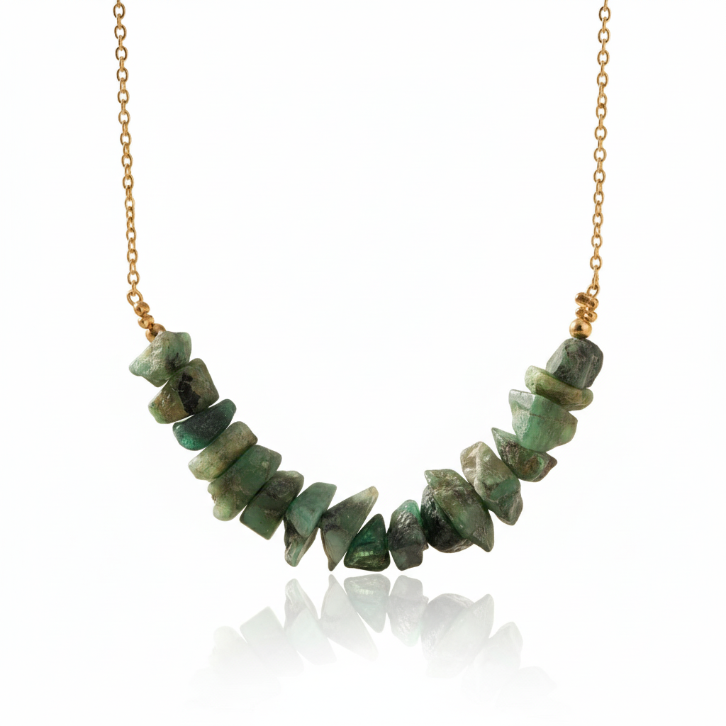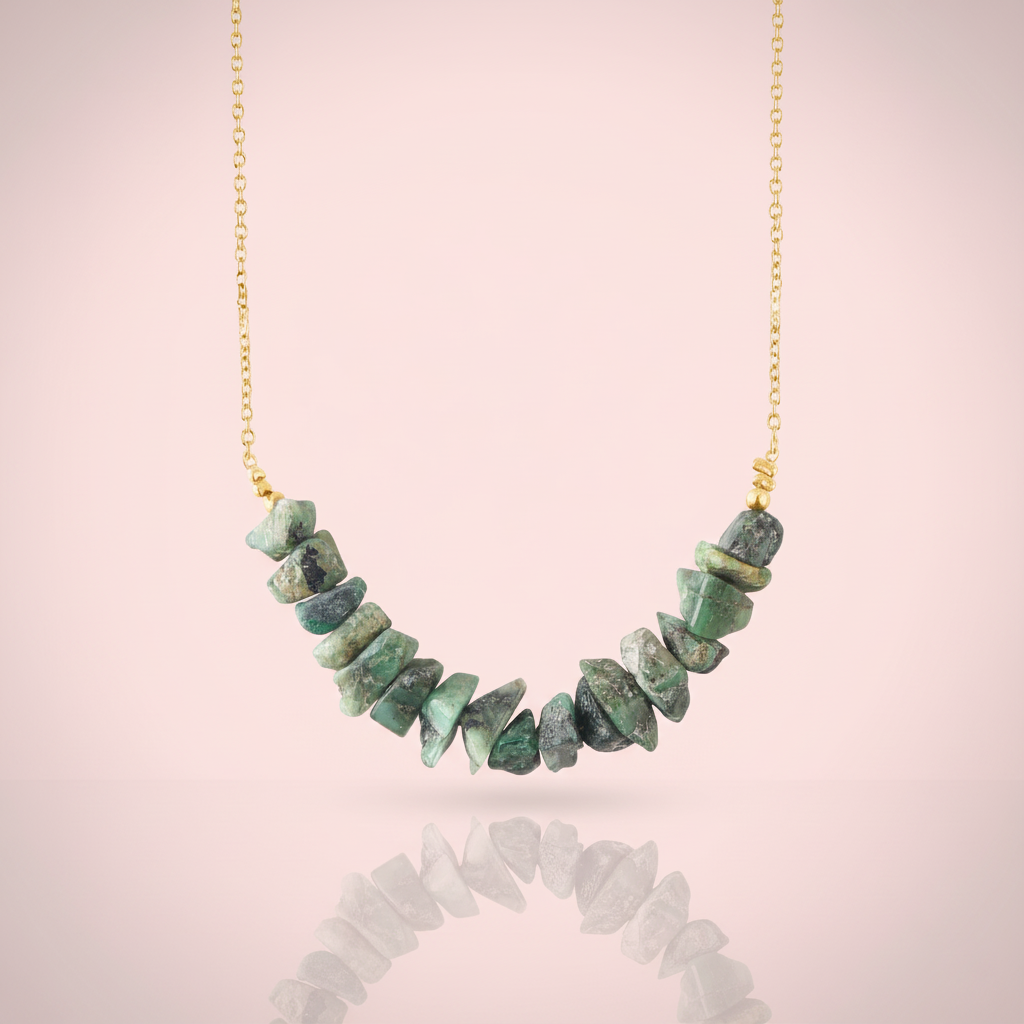 • Elegant bar-style necklace featuring raw, unpolished emerald chip beads arranged in a natural arc