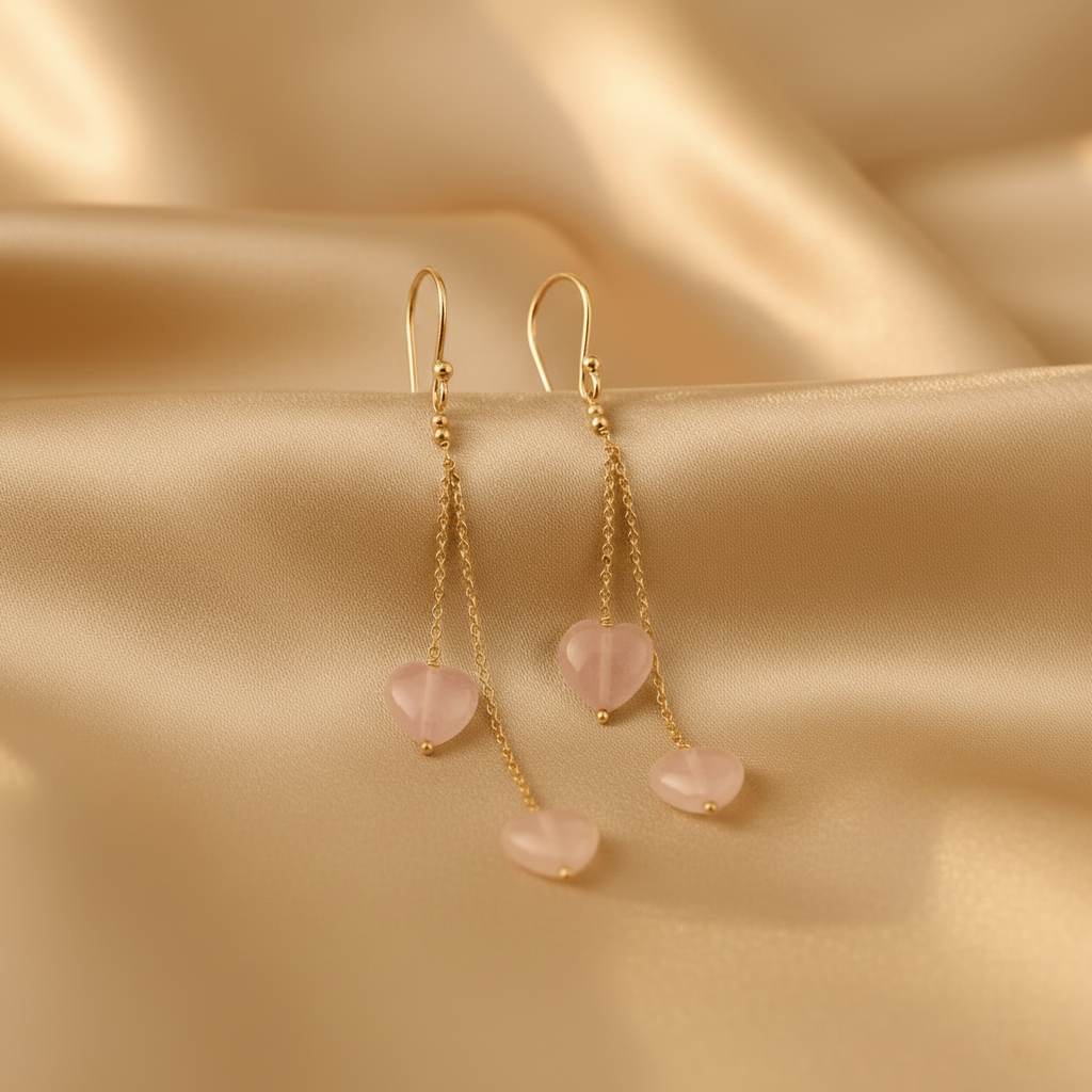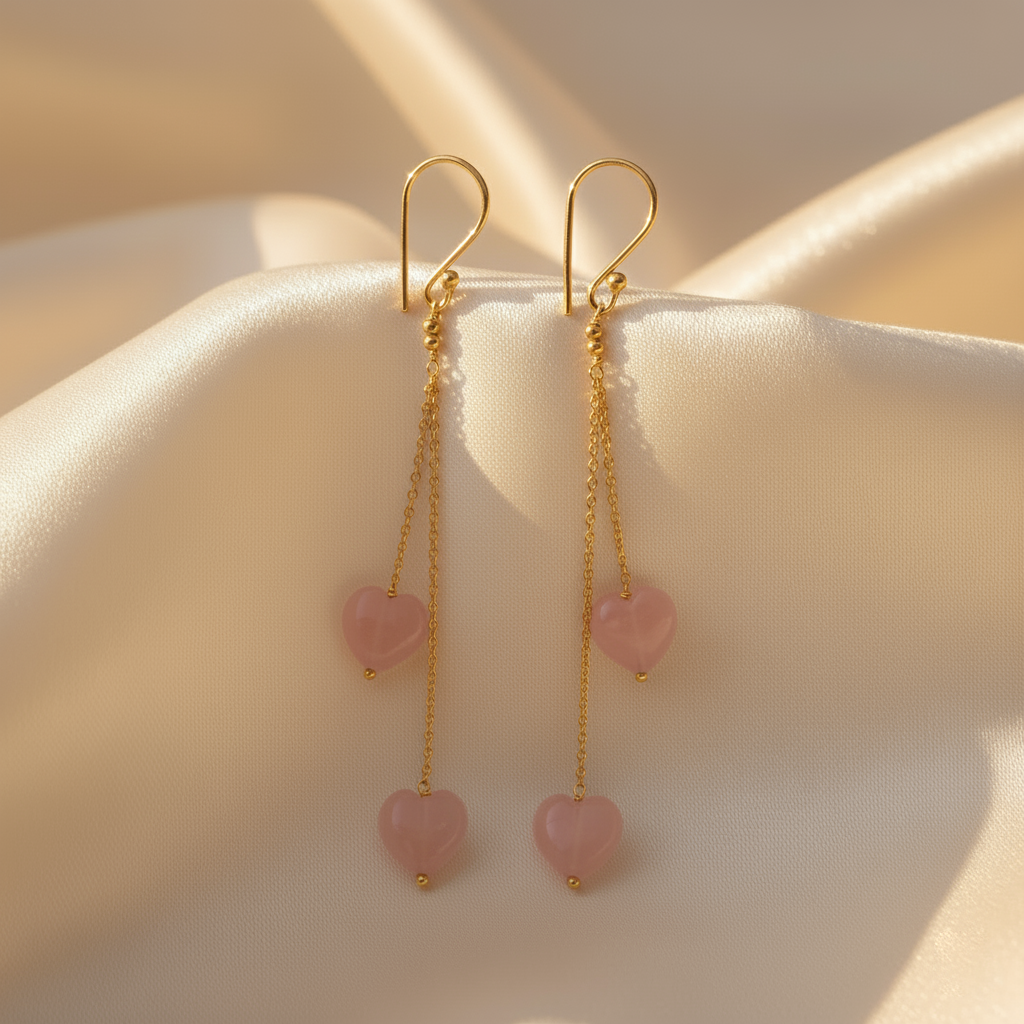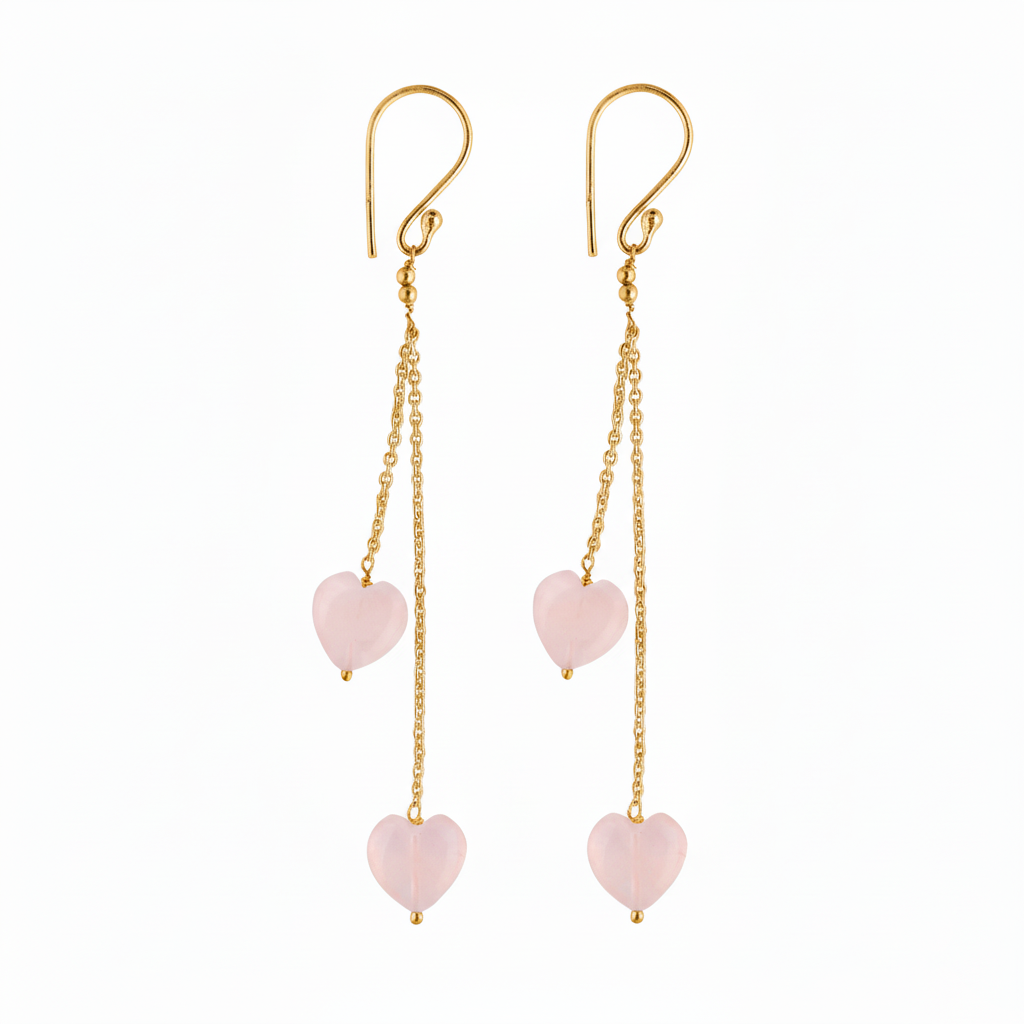 - Elevate your everyday elegance with these stunning Rose Quartz Heart Drop Earrings, crafted for those who wear their heart beautifully. Each earring features two delicate heart-shaped Rose Quartz stones suspended on fine gold-plated chains, secured with smooth shepherd hook clasps — perfect for both casual and special occasions.