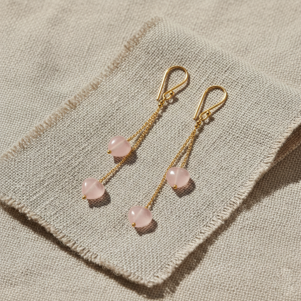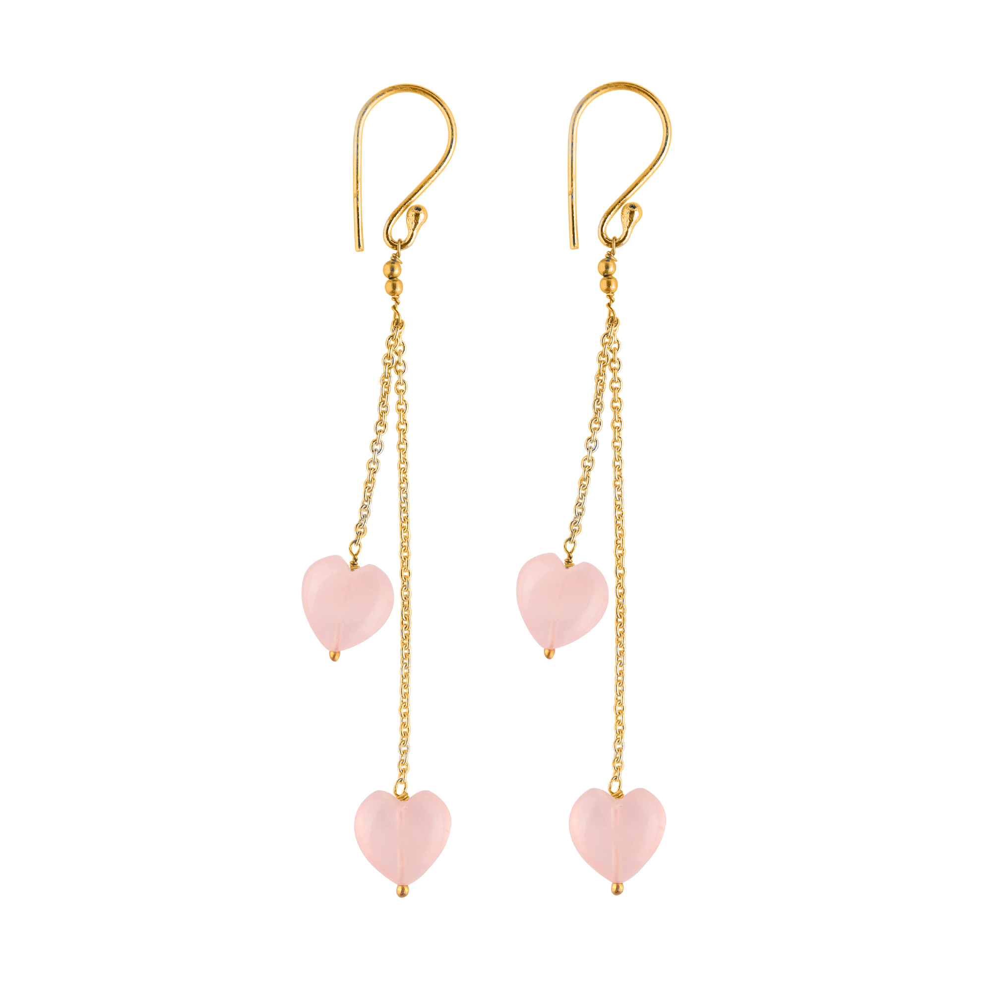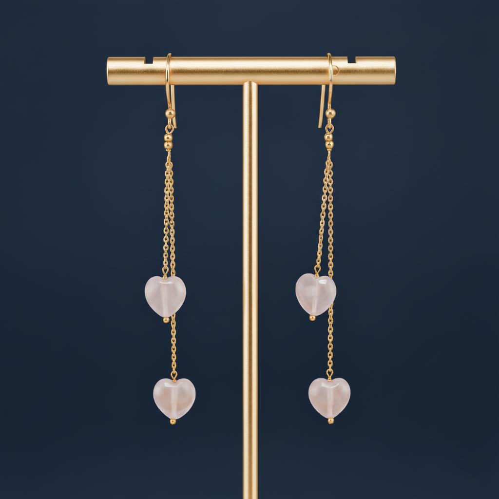 - Elevate your everyday elegance with these stunning Rose Quartz Heart Drop Earrings, crafted for those who wear their heart beautifully. Each earring features two delicate heart-shaped Rose Quartz stones suspended on fine gold-plated chains, secured with smooth shepherd hook clasps — perfect for both casual and special occasions.
