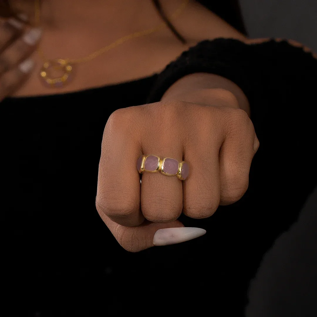 Rose quartz is known for its gentle energy, promoting love, compassion, and emotional healing. Each square stone in this ring is carefully selected and crafted to showcase its natural beauty and unique pattern. The stones are set in a way that allows light to shine through, creating a stunning display of soft pink hues.