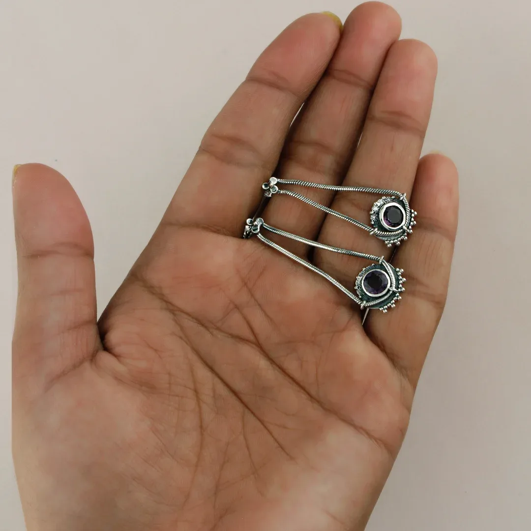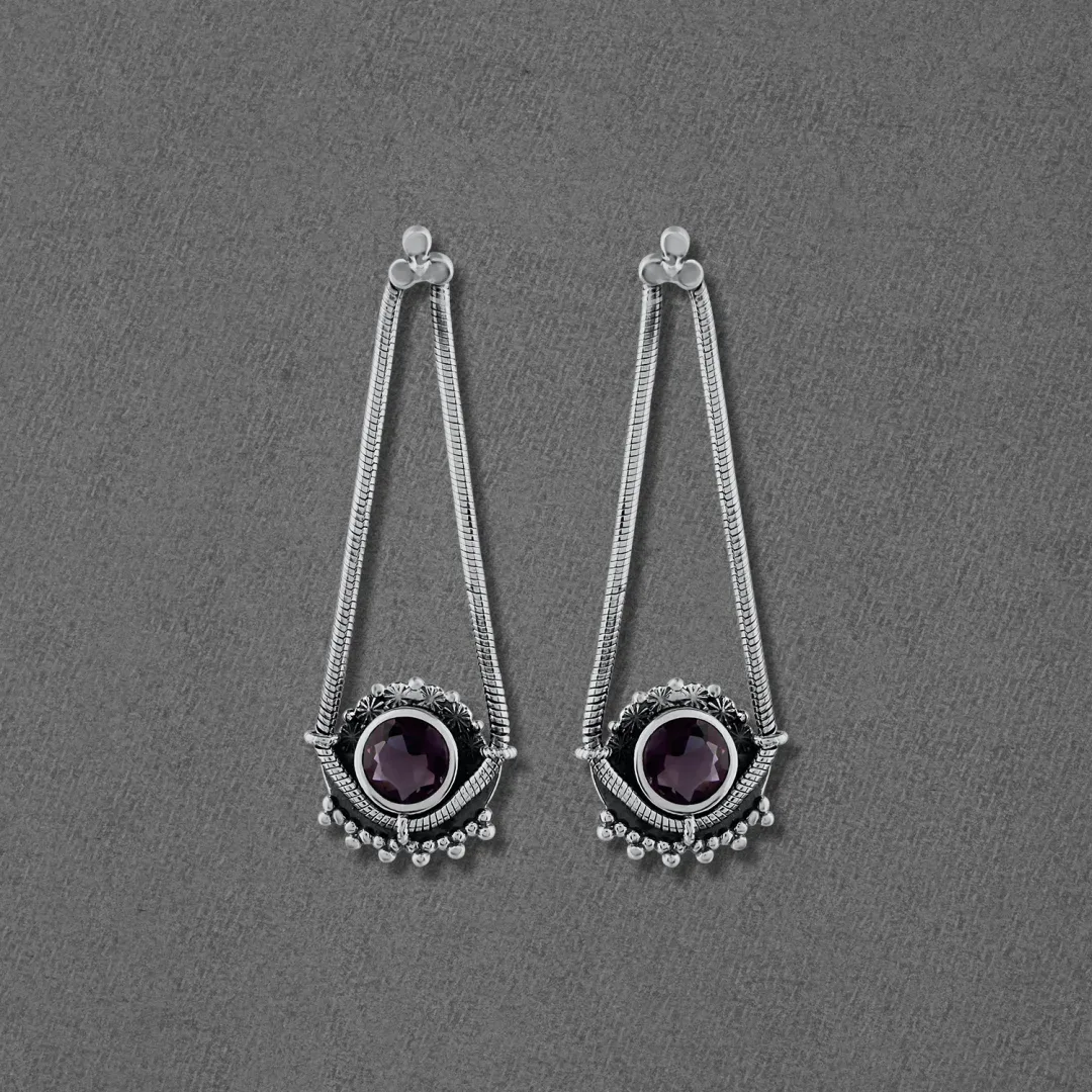 Elevate your style with Silver Dangler Earring featuring a captivating interplay of chains holding a center Amethyst Stone in Unique Sculpted Elegance Style created by Gem O World team.
