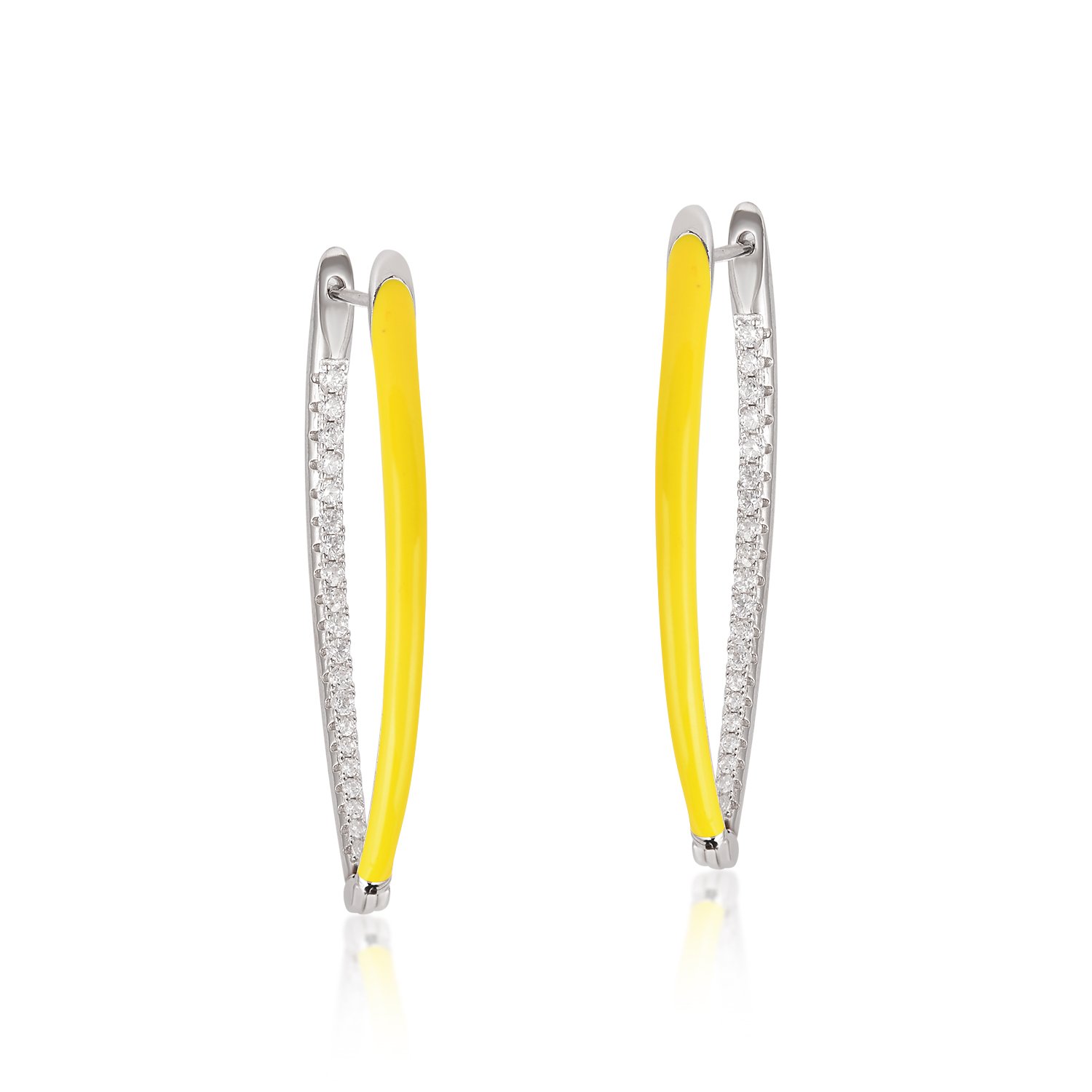 Add a pop of color to your look with these modern sterling silver hoop earrings. Featuring a sleek yellow enamel finish on one side and a row of sparkling crystal accents on the other, these earrings effortlessly blend playful vibrancy with timeless elegance. The slender, curved design offers a contemporary silhouette, perfect for everyday wear or special occasions. Crafted in 925 sterling silver, these lightweight earrings ensure comfort without compromising on style. Pair them with casual or formal outfits for a fresh and radiant touch.