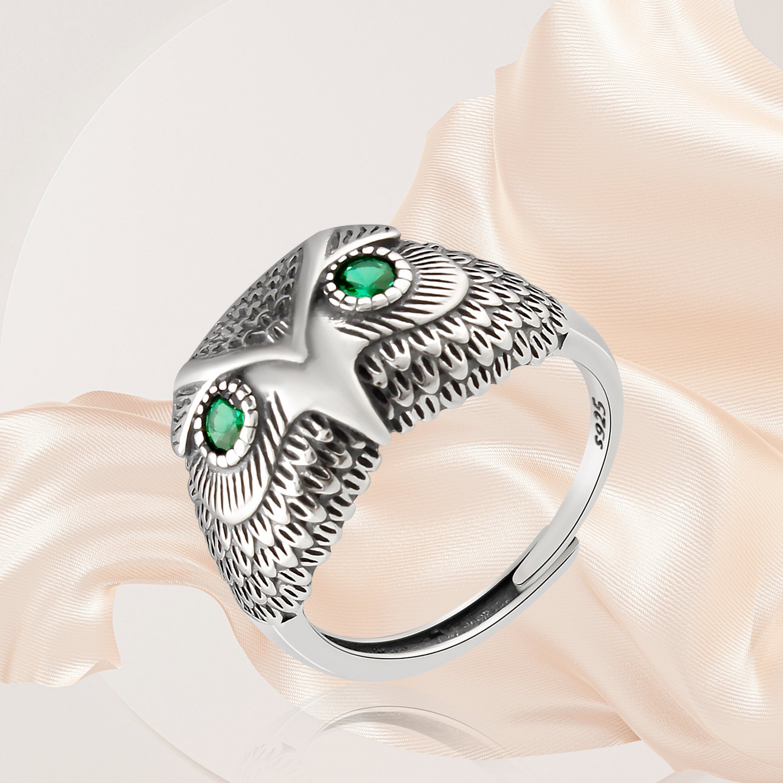 Sterling Silver Owl Ring with Green Gemstone Eyes – Intricately Designed Statement Jewelry