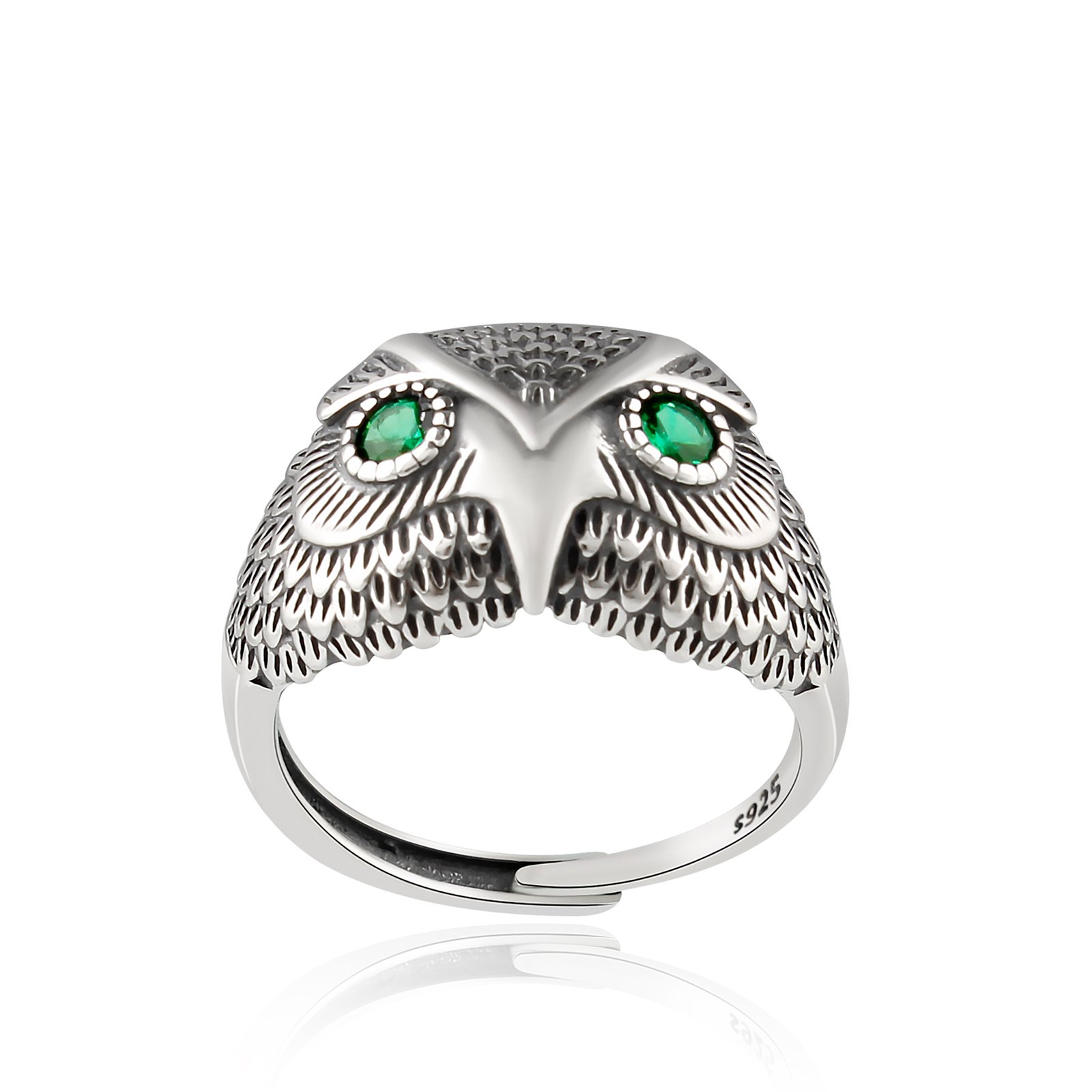 Embrace the wisdom and mystique of the owl with this striking sterling silver ring. Meticulously crafted from premium 925 sterling silver, the design captures the essence of an owl’s face, complete with intricate feather details. The piercing green gemstone eyes add a captivating touch, symbolizing insight and intuition. Perfect for nature enthusiasts or as a statement accessory, this ring seamlessly combines elegance with symbolic artistry. An excellent choice for gifts or personal collections, this owl ring speaks volumes about your style and love for unique jewelry.