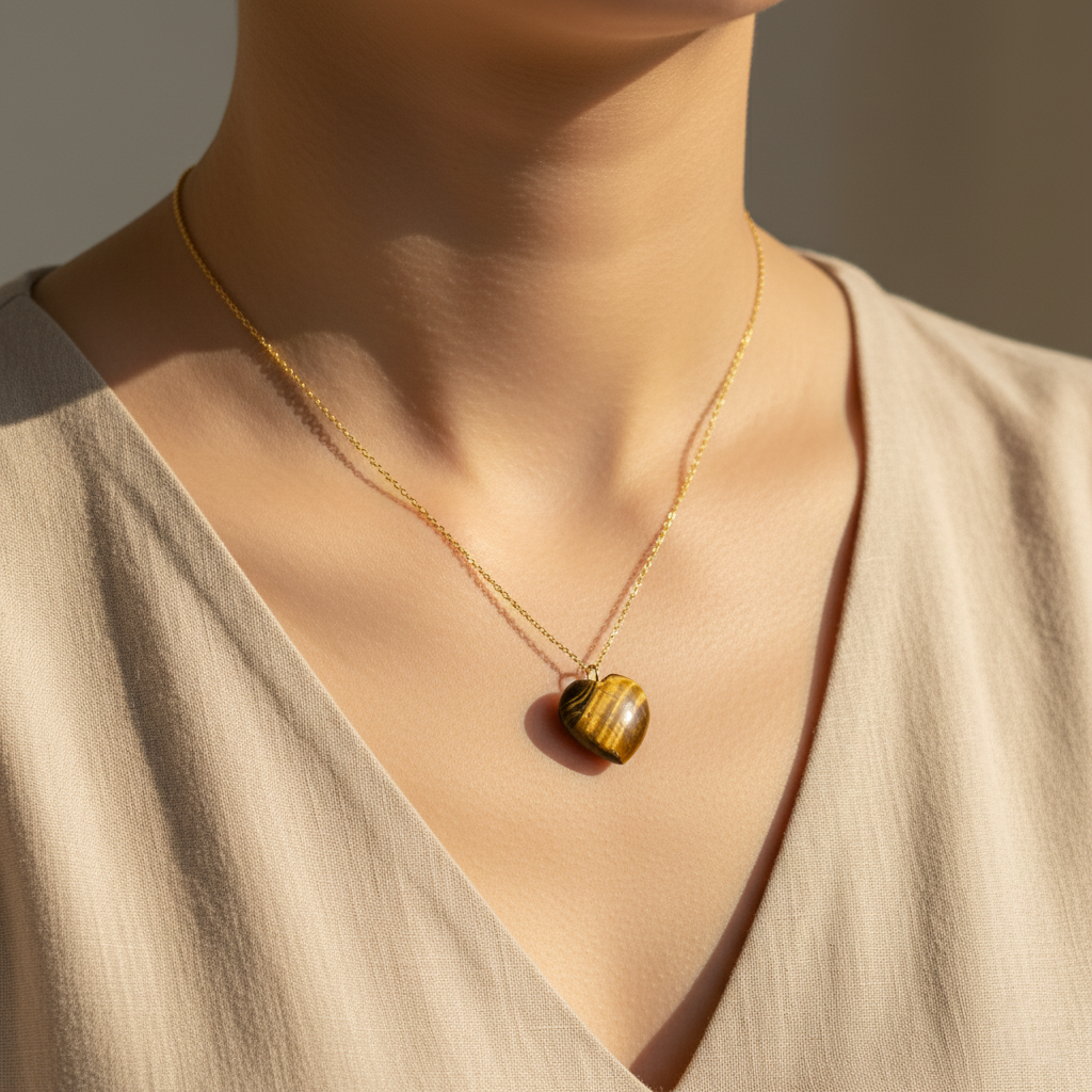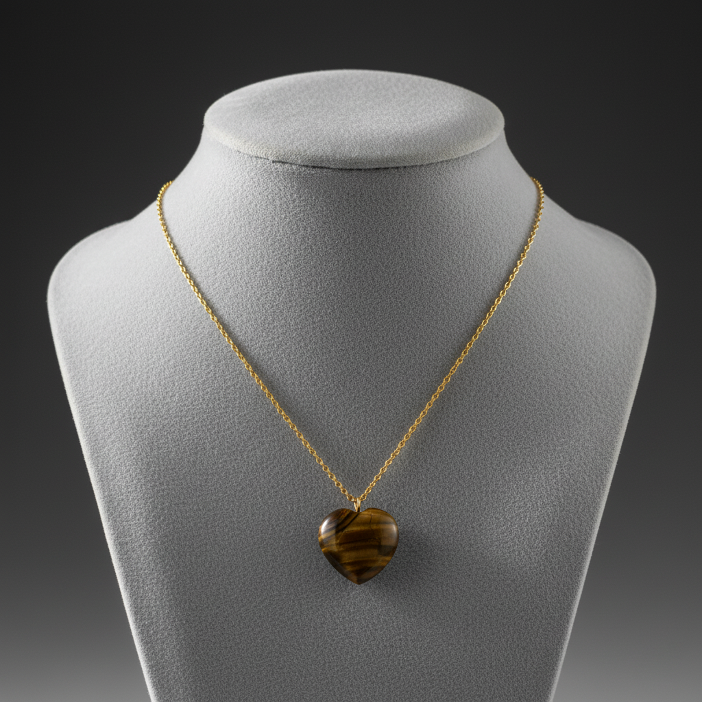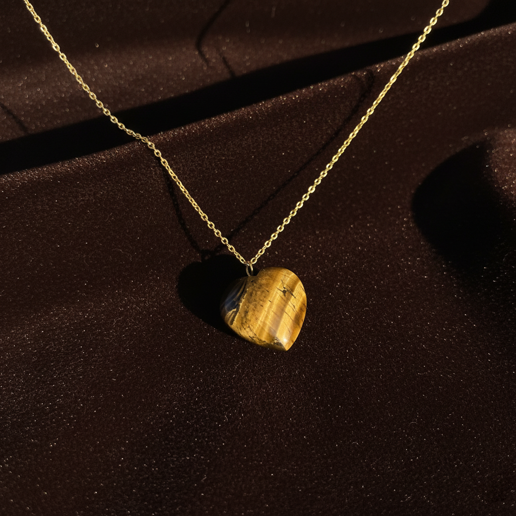 - A beautifully polished Tiger Eye heart-shaped pendant suspended on a delicate gold plated cable chain, perfect for everyday wear and gifting.