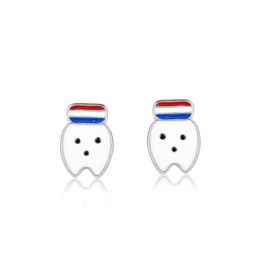 Tooth Silver Stud Earrings with Enamel Accents