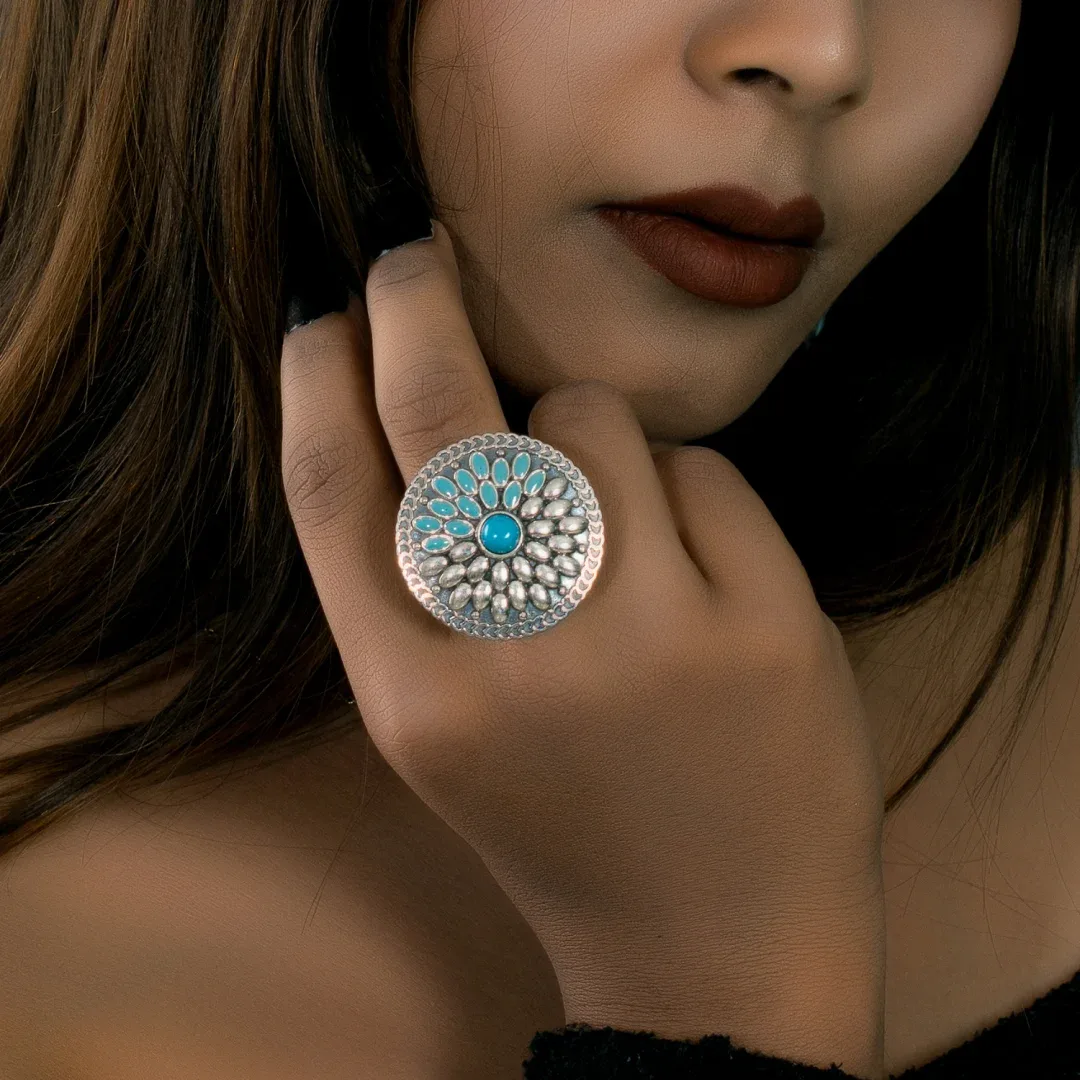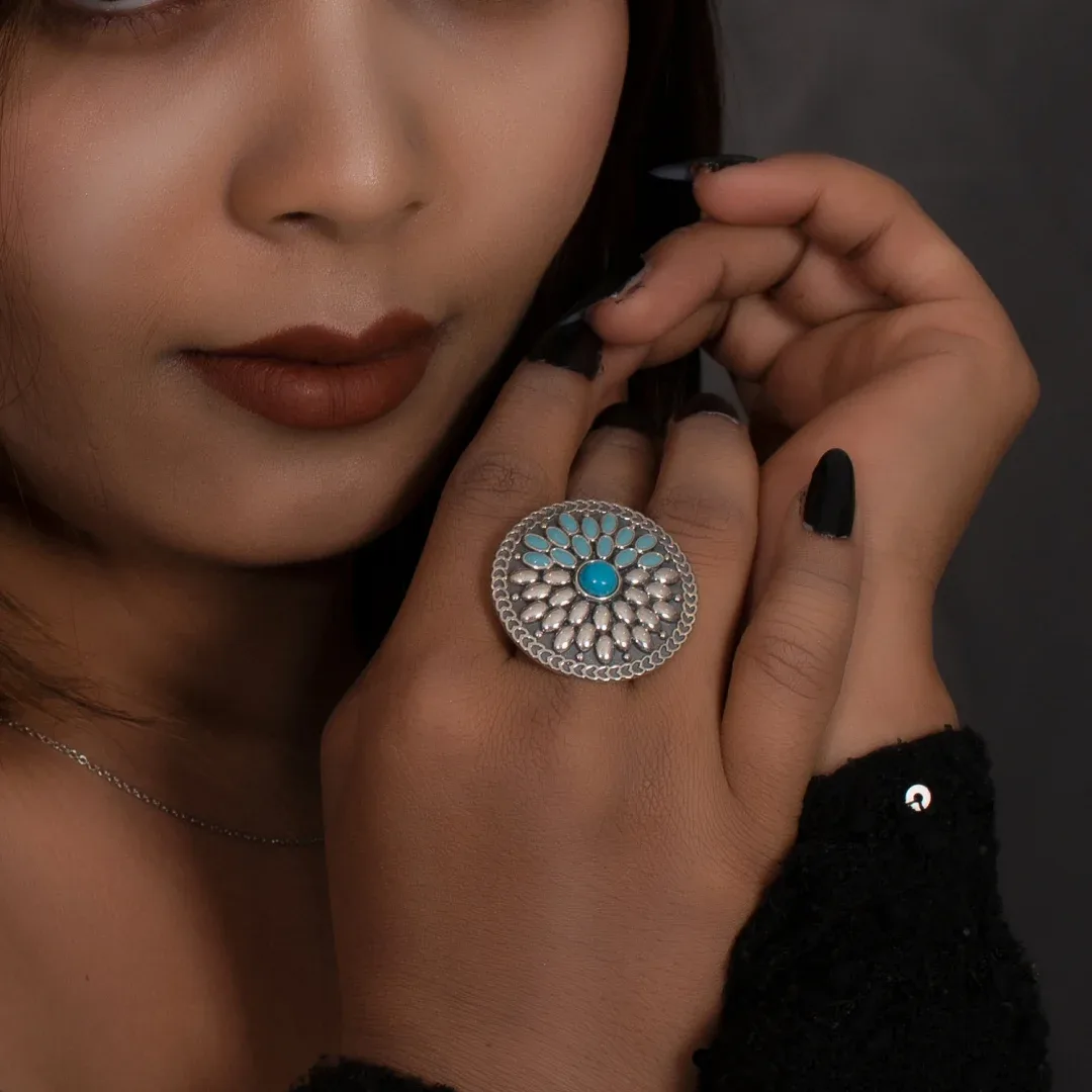- Experience the harmonious blend of natural beauty and refined craftsmanship with our women’s silver ring, showcasing a mesmerizing turquoise stone and a band embellished with sky blue enamel.