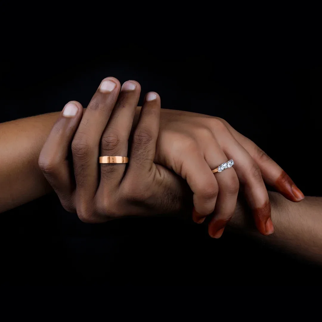 Designed for couples this ring captures the essence of togetherness in a stunning piece of jewelry. The Trillion? patterns on the ring symbolize the Interweaving paths of two individuals who have come together to create a harmonious journey. The carefully carved lines and curves reflect the uniqueness of your bond, a bond that is both strong and delicate.